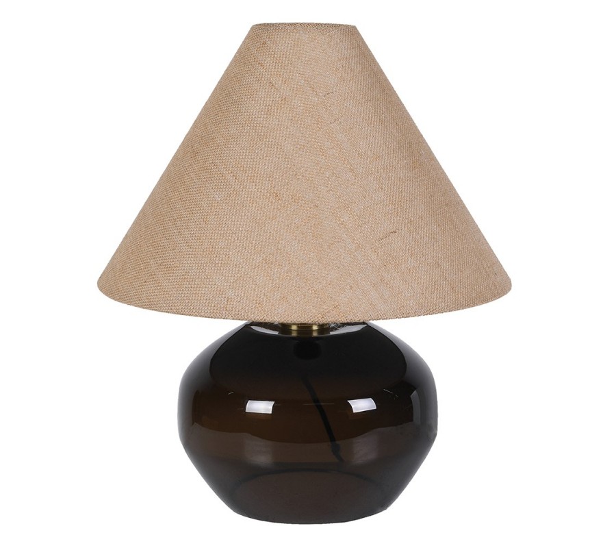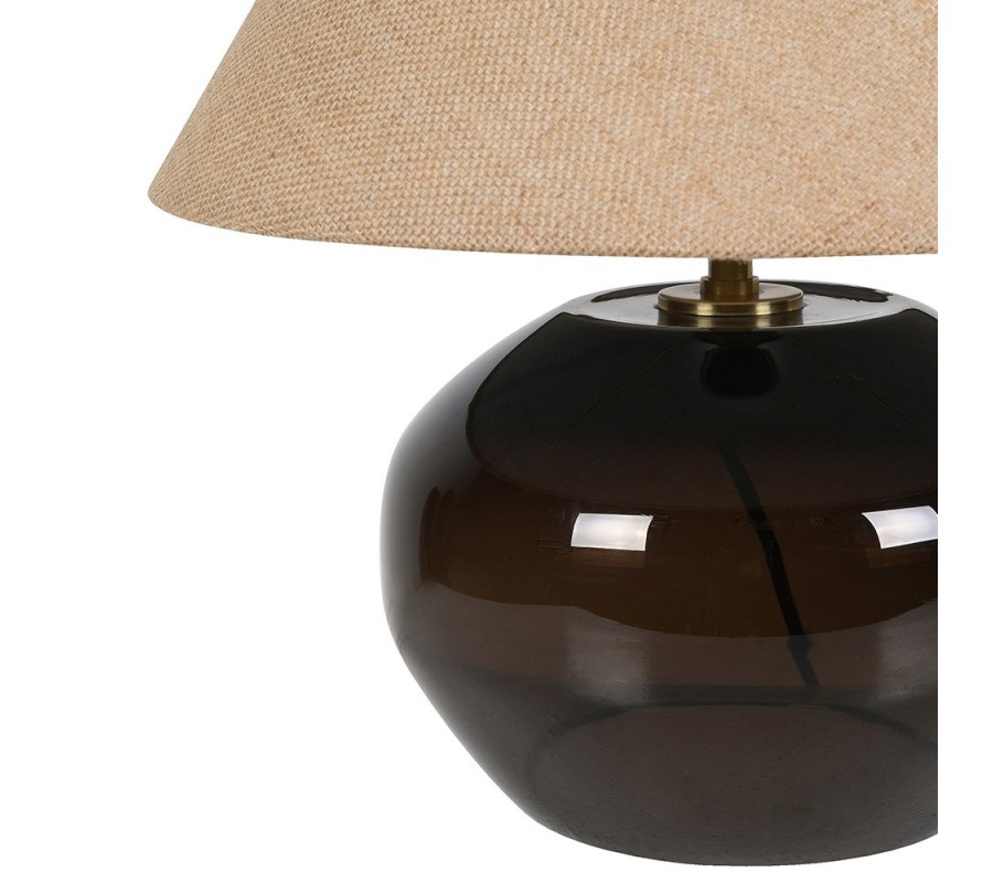 Moderná stolná lampa Globe vyniká svojím harmonickým spojením prírodných materiálov a elegantného tvaru. Noha lampy má tvar jemne sploštenej gule a je vyrobená z čiastočne priehľadného plastu so skleneným efektom v tmavohnedom odtieni. Materiál poskytuje vzhľad skla, no zároveň je ľahší, odolnejší a nerozbitný, čo zvyšuje praktickosť lampy v každodennom používaní. Tento povrch s hĺbkou farby dodáva lampe sofistikovaný a dekoratívny vzhľad.