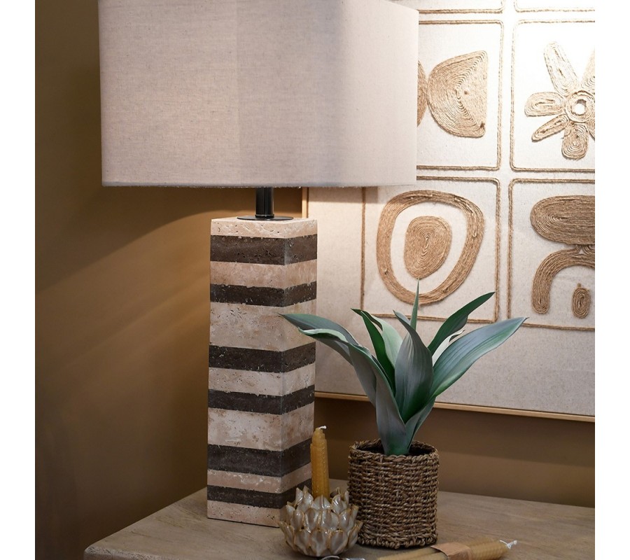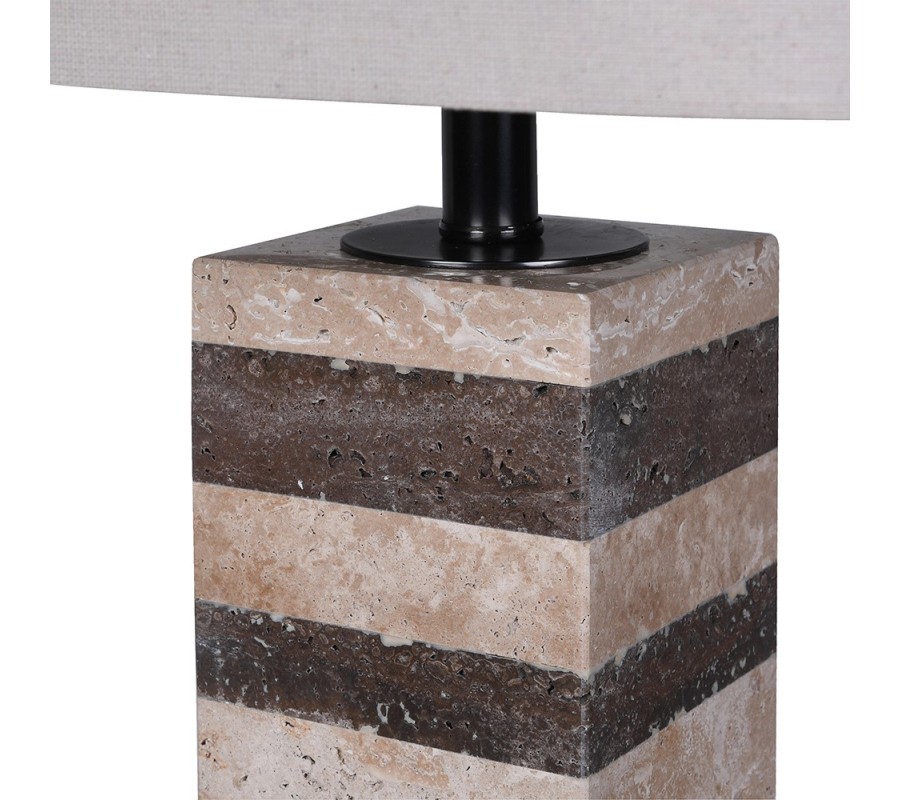 Dizajnová moderná stolná lampa Cubbie s hranatým tienidlom a pruhovanou kamennou podstavou v hnedých a béžových tónoch 72 cm