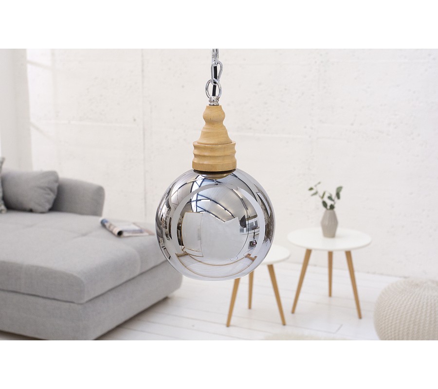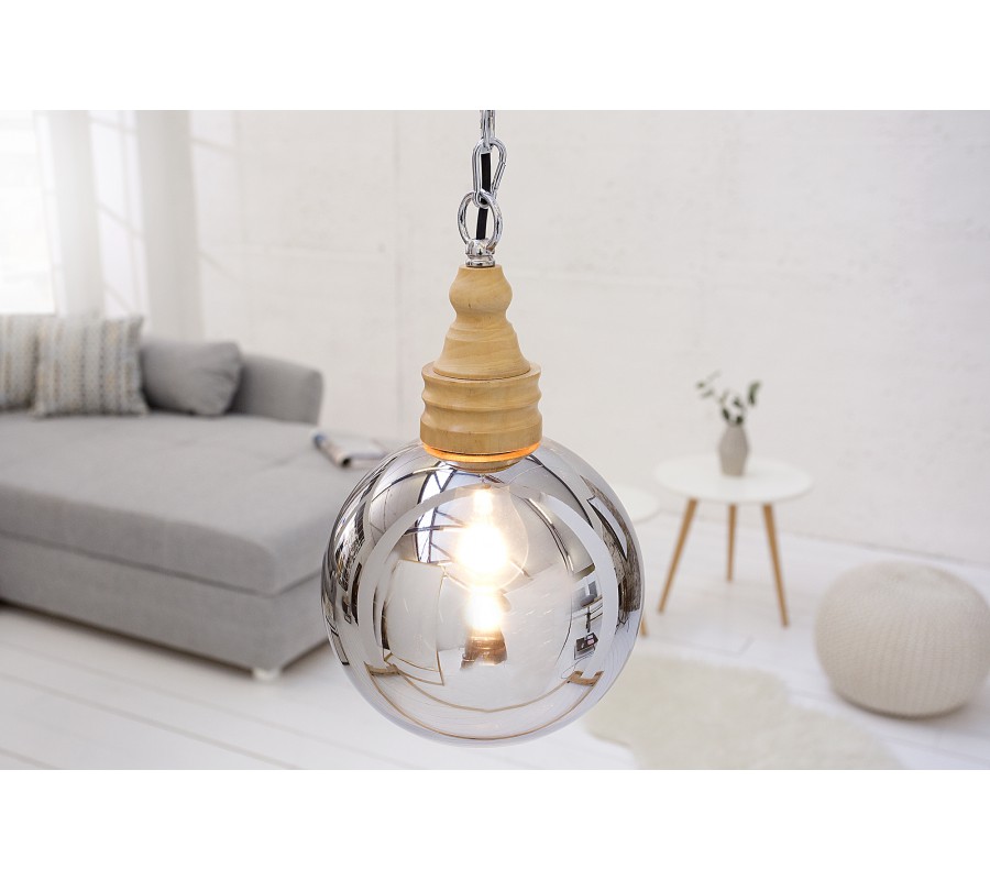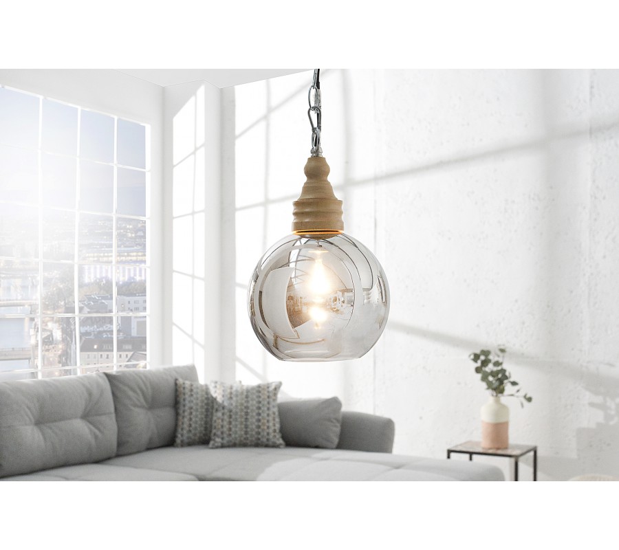 Dizajnové jedinečné závesné svietidlo Bola v retro štýle je doplnená dreveným prvkom. Svietidlo je vyrobené z jedneho kusa skla. Rozmery: 20 cm x 30 cm x 20 cm (ŠxVxH) Celkový priemer: 65cm Dĺžka kábla: 85cm Svetelný zdroj: 1 x E27 max. 40W. Energetická trieda A ++. Žiarovky nie su súčasťou dodávky.
