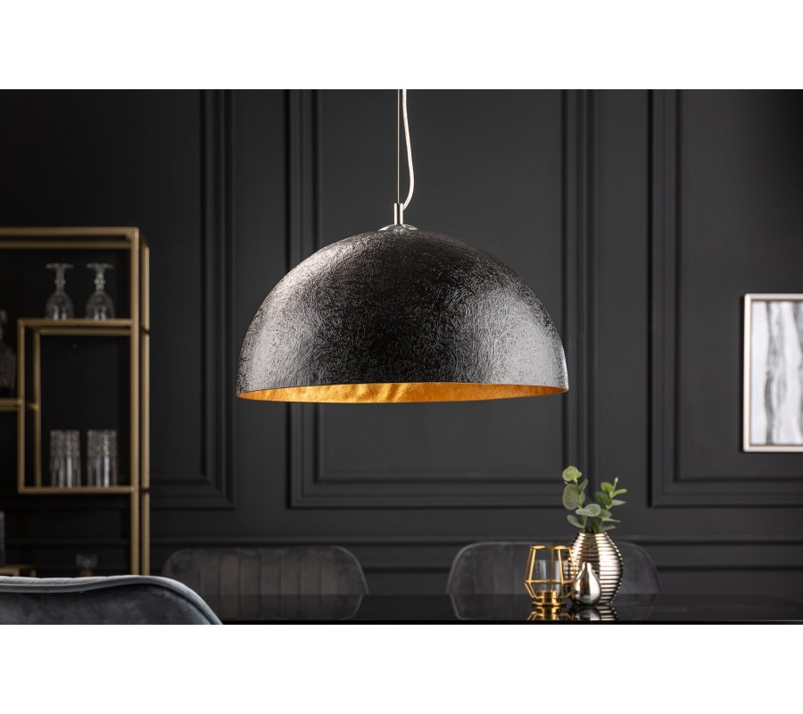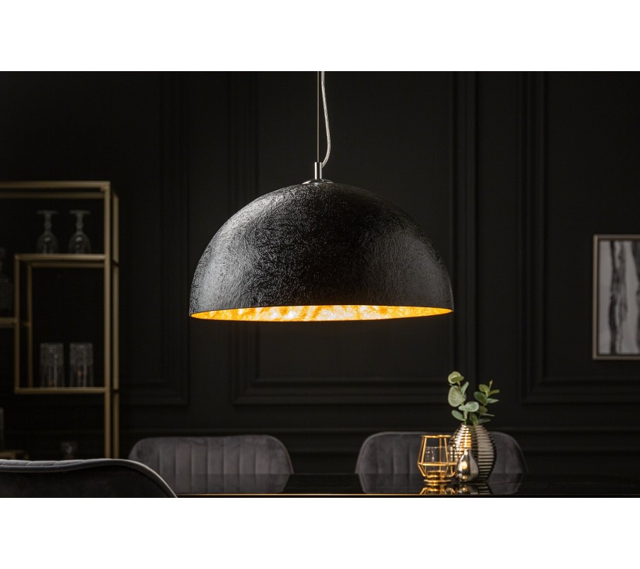 Moderná čierno zlatá sklolaminátová lampa Glow je unikátnym prvkom, ktorý prežiari každý interiér, najmä potom dizajnovo zariadené priestory prípadne priestory zariadené v štýle Art-deco. Priemer lampy činí 50cm a výška 25cm. Lampa je prispôsobená pre žiarovku s maximálnym výkonom 60W alebo E27. Energetická hodnota A++ až E Dodává sa bez žiarovky.