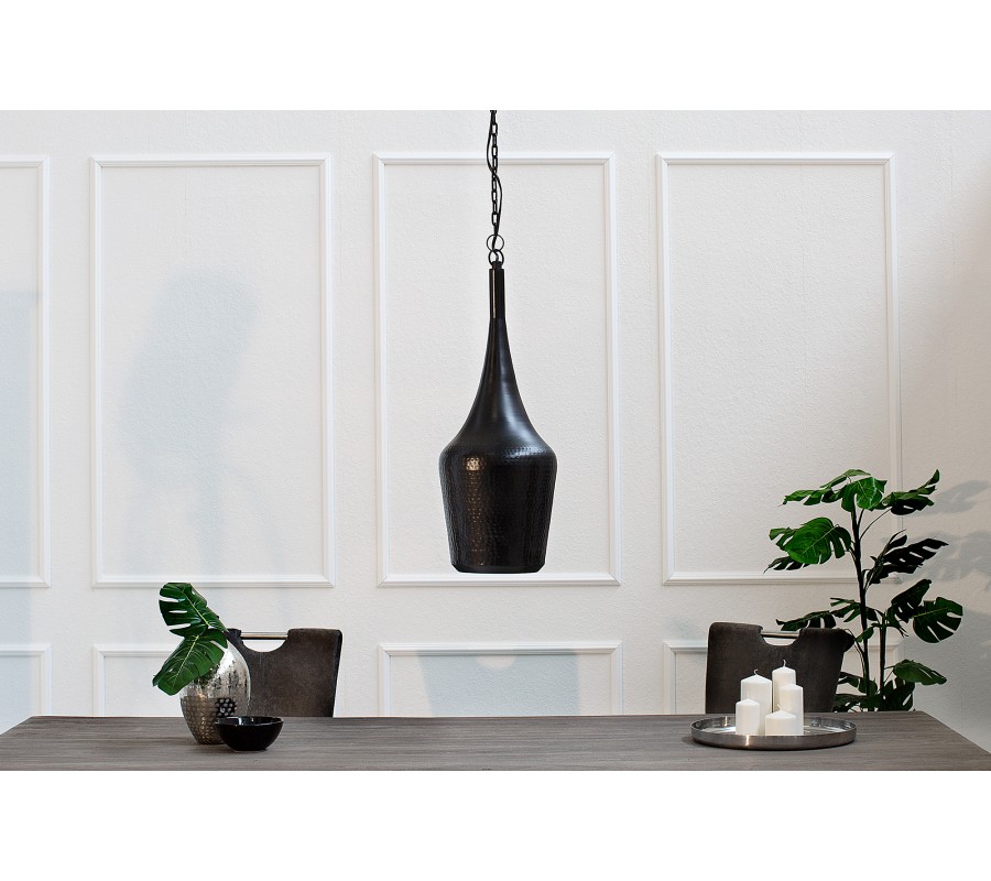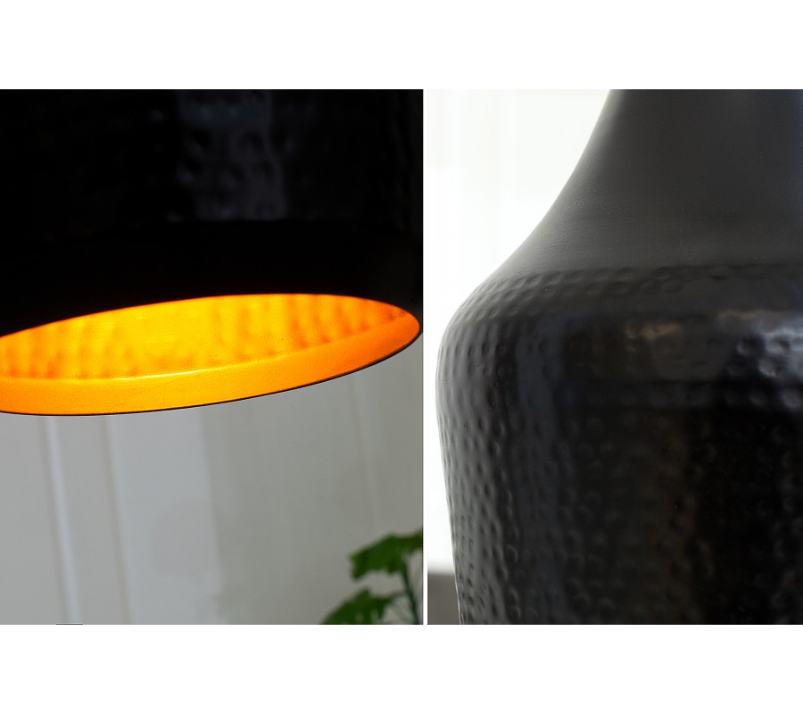 Dizajnová závesná lampa s čiernou a medenou vnútornou farbou je skvelým kúskom do moderne alebo industriálne zariadených interiérov. Má štýlové prepracované zavesenie v podobe reťazí. Svojim nerovným povrchom vzniká originálny a dizajnový kúsok do Vašej domácnosti. Je atypického tvaru a veľmi sa hodí ako lampa zavesená nad masívnym jedálenským stolom. Vnútorná farba je medená, ktorá krásne žiari pri spustení svetla, a tým osvetľuje miestnosť krásnymi teplými farbami. Je vyrobená z kovu a mosadze.