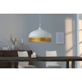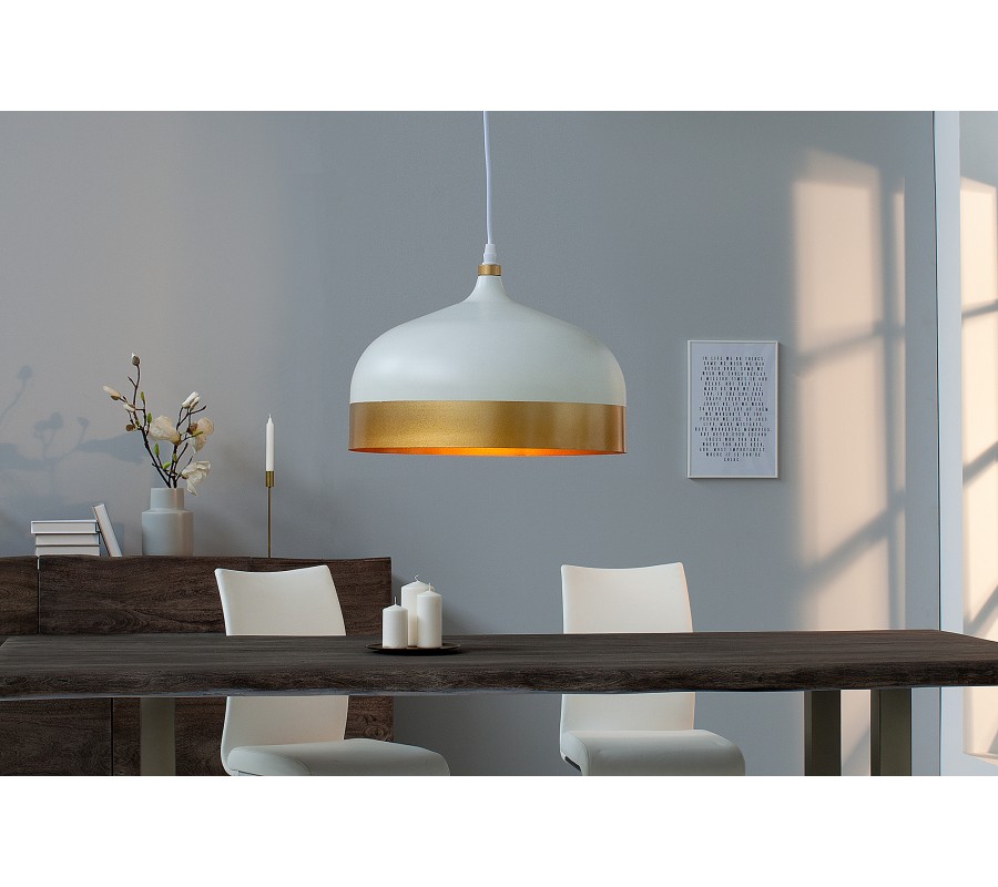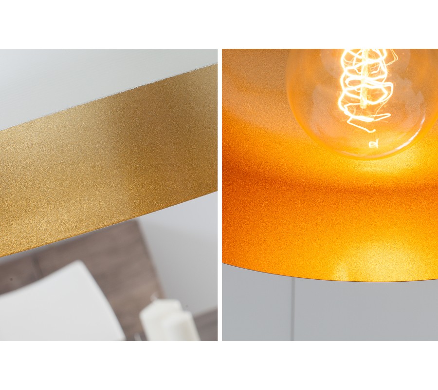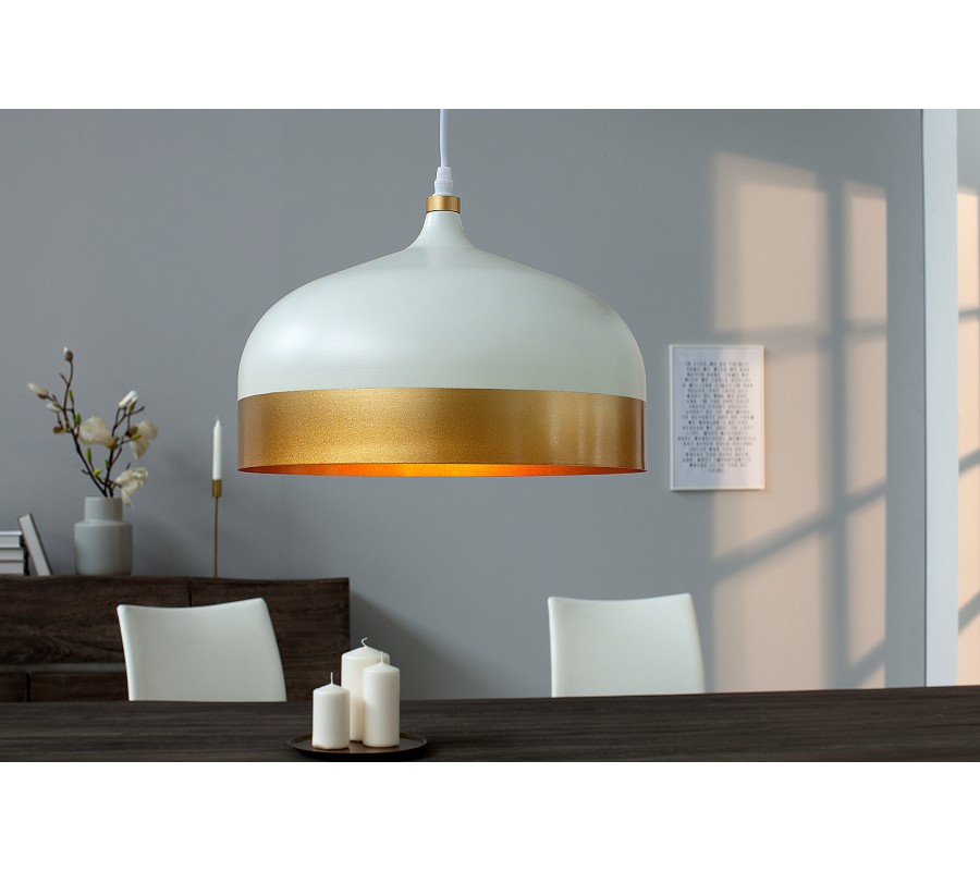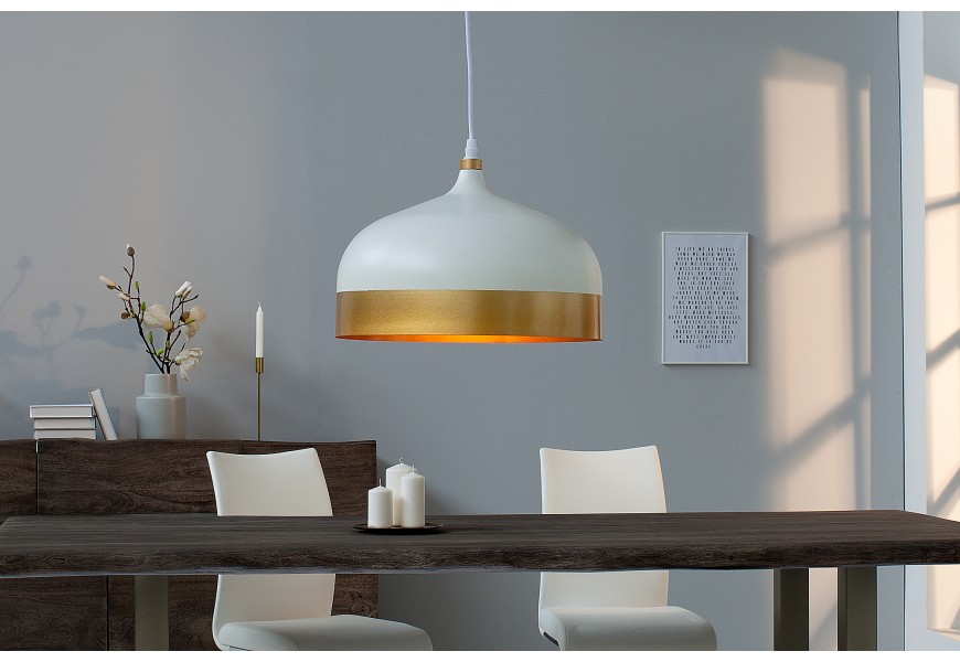 Dizajnová závesná lampa Modern Chic v bielo-zlatom farebnom prevedení naplní očakávania všetkých nadšencov moderného interiérového zariadenia. Jednoduchá, no pritom elegantná kovová konštrukcia vo svetlých tónoch robí lampu vhodnou najmä k bielym stenám a minimalistickým kusom nábytku. Zlatá farba dodá miestnosti žiarivý farebný akcent, no zároveň nebude pôsobiť rušivo. Túto lampu predávame aj v čierno-zlatej farebnej kombinácií.