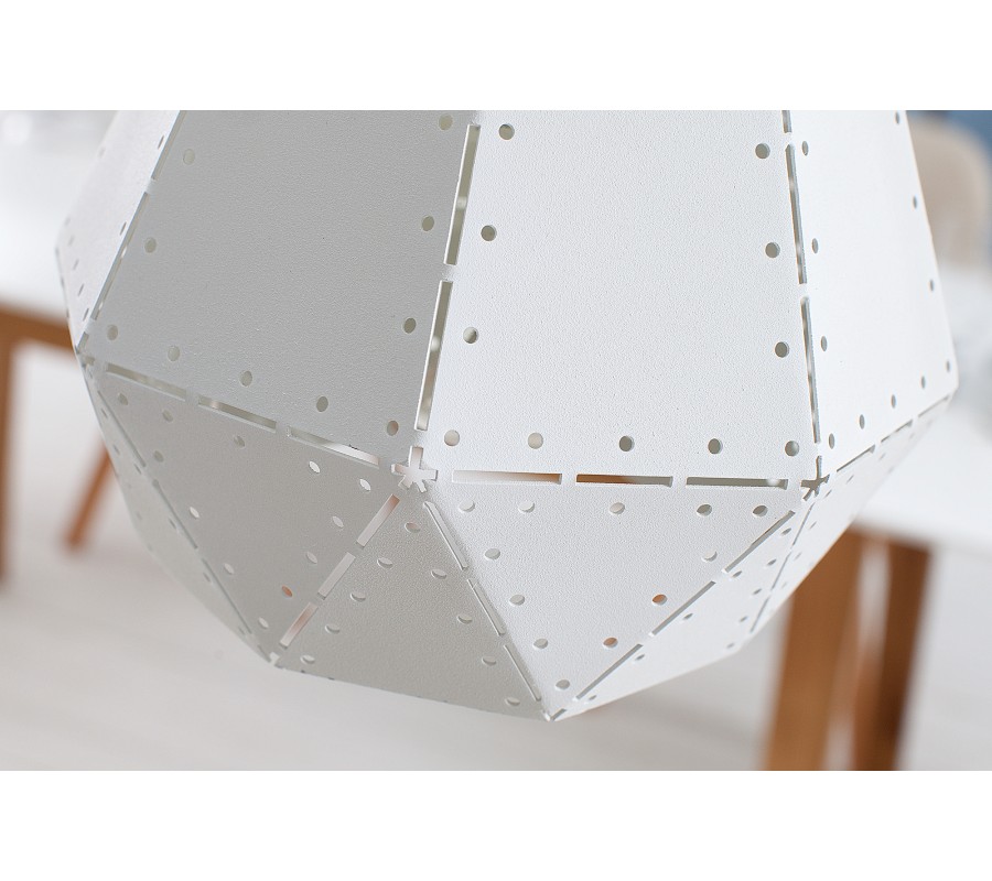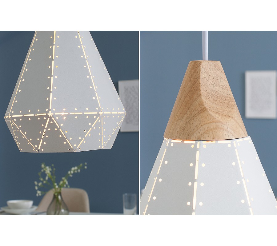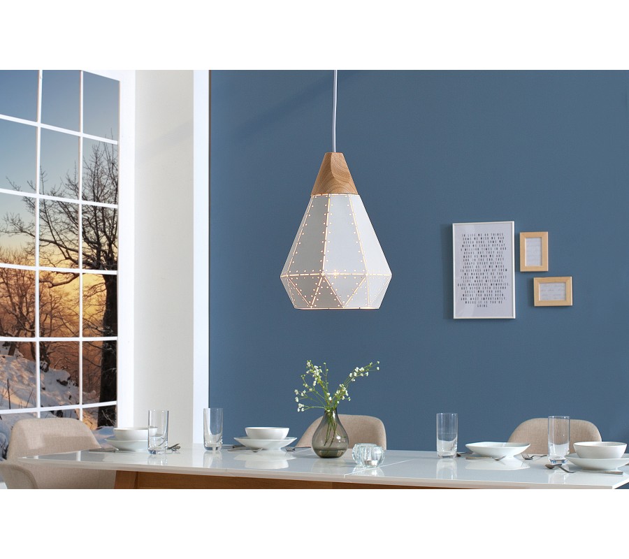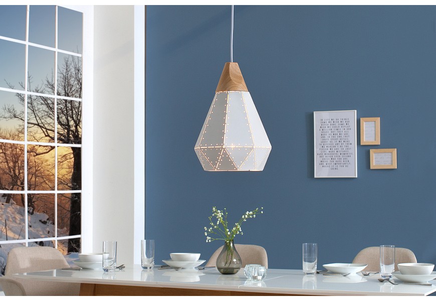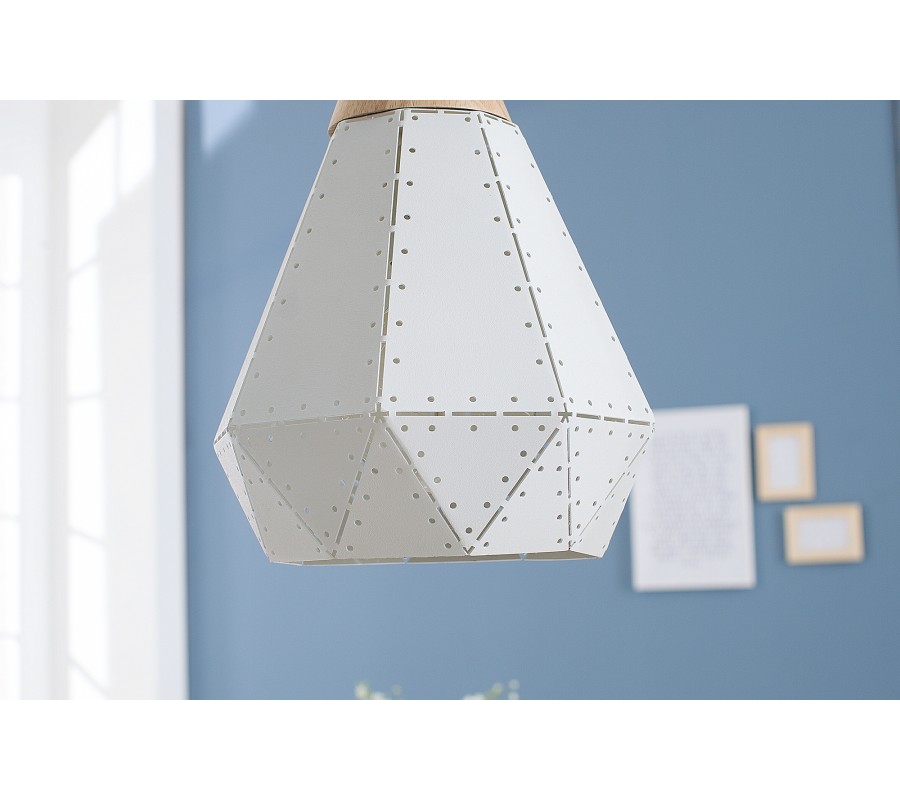 Dizajnová závesná lampa Scandinavia v bielom farebnom prevedení upúta vďaka svojej jedinečnej a štýlovej geometrickej konštrukcii už na prvý pohľad. Masívne, biele tienidlo z perforovaných kusov kovu v kombinácii s masívnym drevom dodáva lampe jemne industriálny nádych, ktorý dodá šmrnc každej moderne zariadenej domácnosti. Ideálnou voľbou tak bude či už do rôznych moderných, škandinávsky ladených alebo do typicky industriálnych priestorov. Farebná neutrálnosť zasa zabezpečuje ľahkú kombinovateľnosť s kúskami v jemných ale aj výrazných farebných odtieňoch