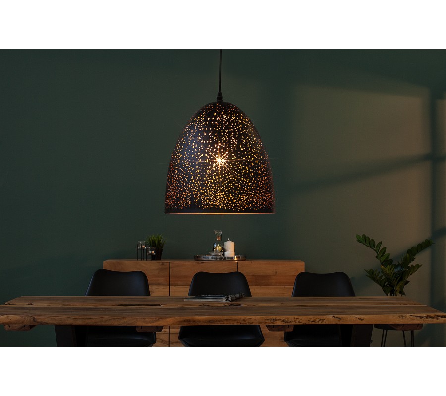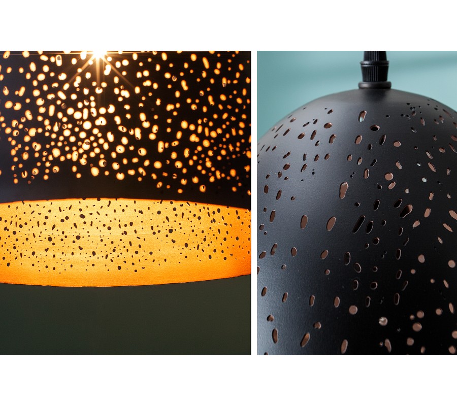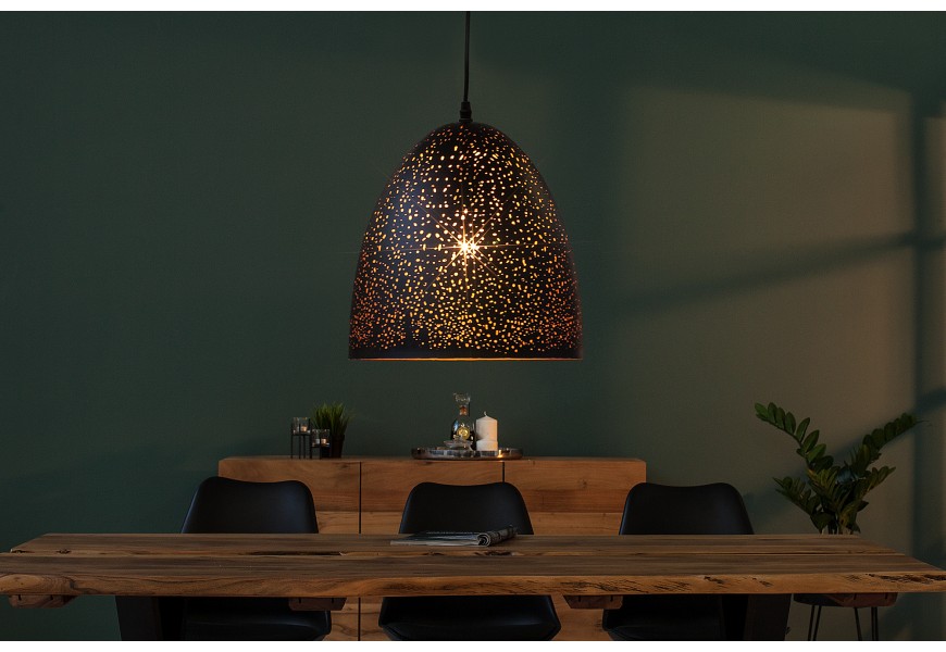 Dizajnová závesná lampa Night Sky II sa stane dokonalým doplnkom každej moderne zariadenej domácnosti. Jednoduchý, no pritom nápaditý kúsok v neutrálnej tmavej farbe sa hodí do priestorov ladených v jemných, ale aj výrazných farebných tónoch. Jedinečnosť tejto závesnej lampy spočíva predovšetkým vo veľkom, nepravidelne perforovanom tienidle, ktoré po rozsvietení vytvorí v miestnosti nádherný svetelný efekt a dodá jej tak nezameniteľnú atmosféru.