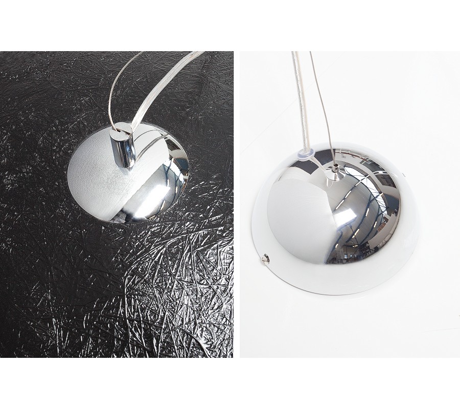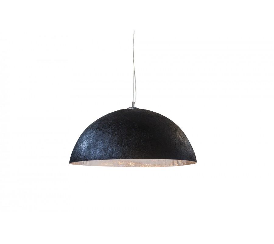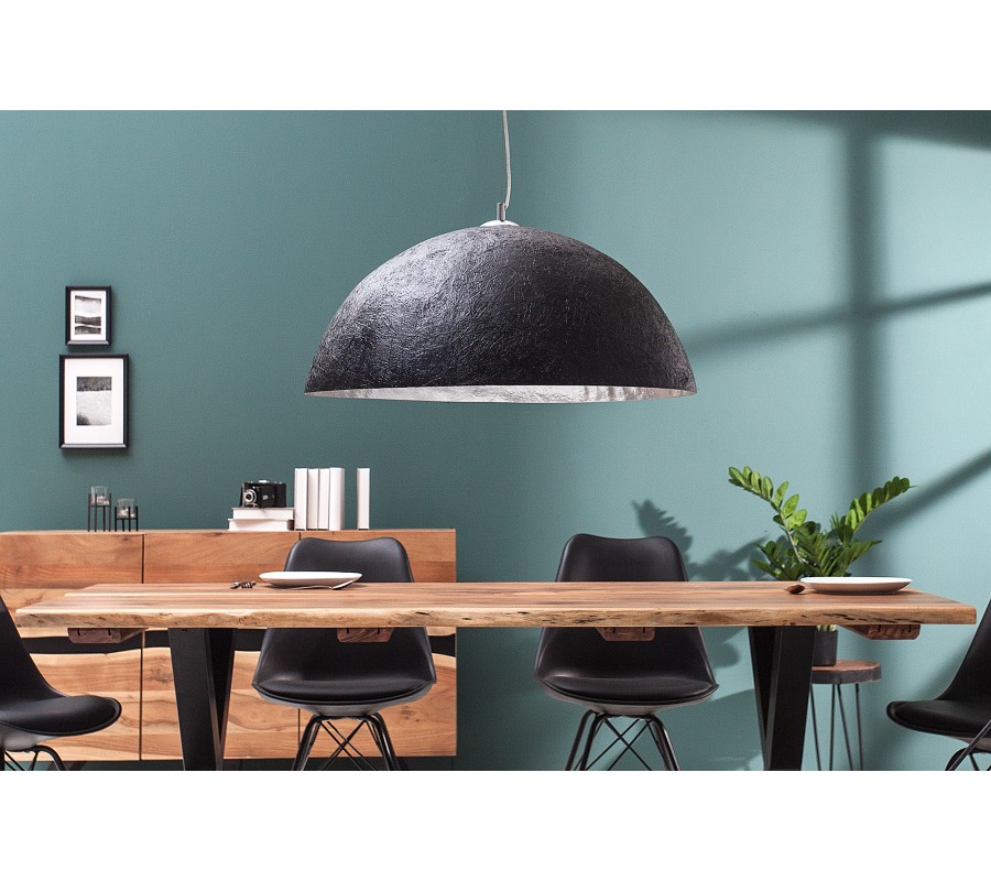 Dizajnová závesná lampa Glow je kúskom industriálneho štýlu čiernej farby, hlavne do interiérov zariadených v tomto štýle, ale hodí sa aj do moderne zariadených miestností. Vnútro oblúka je striebornej lesklej farby, aby pri svietení rozjasňovalo miestnosť. Lampa má zaujímavý netypický povrch, ktorý z lampy robí unikátny kúsok. Skvelo zapôsobí nad jedálenským stolom v miestnostiach v tmavších odtieňoch. Lampa je vyrobená zo sklolaminátu.