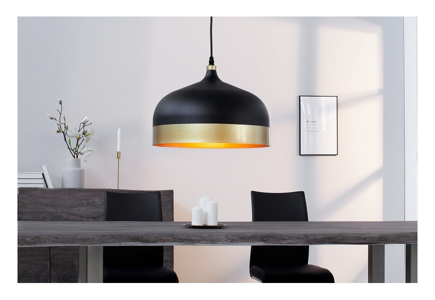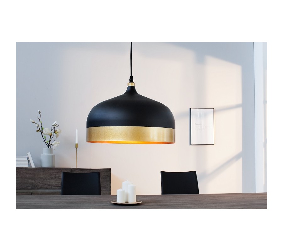 Dizajnová závesná lampa Modern Chic v čierno-zlatom farebnom prevedení naplní očakávania všetkých nadšencov moderného interiérového zariadenia. Jednoduchá, no pritom elegantná kovová konštrukcia v tmavých tónoch robí lampu vhodnou stenám rôznych a minimalistickým kusom nábytku. Zlatá farba dodá miestnosti žiarivý farebný akcent, no zároveň nebude pôsobiť rušivo. Túto lampu predávame aj v bielo-zlatej farebnej kombinácií.