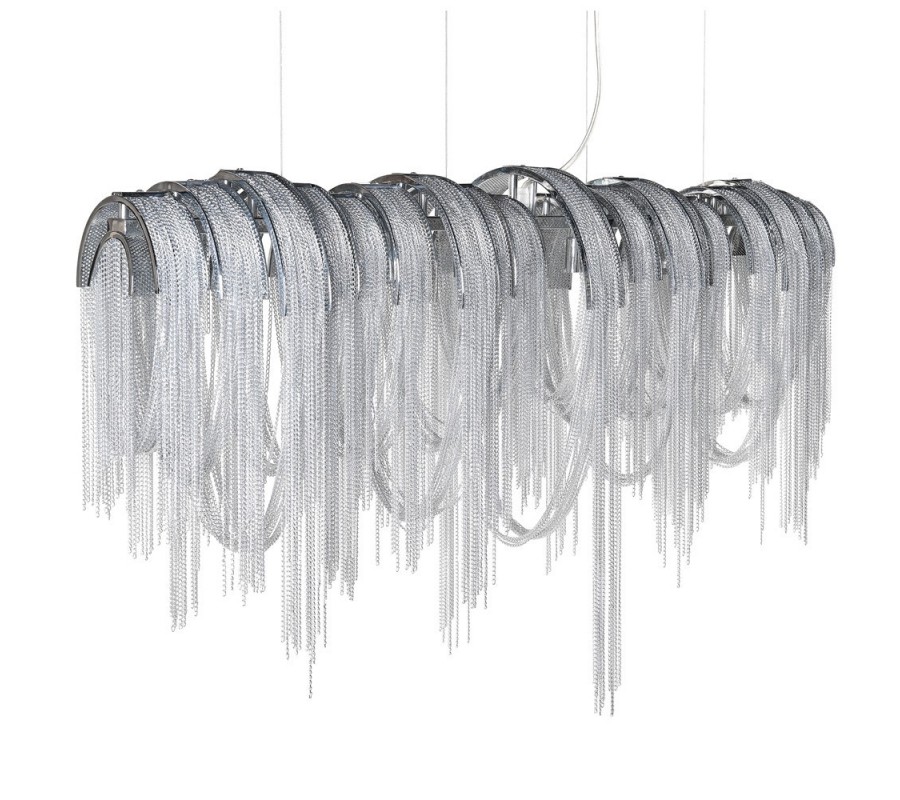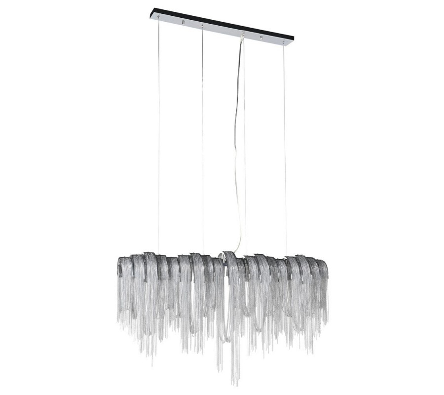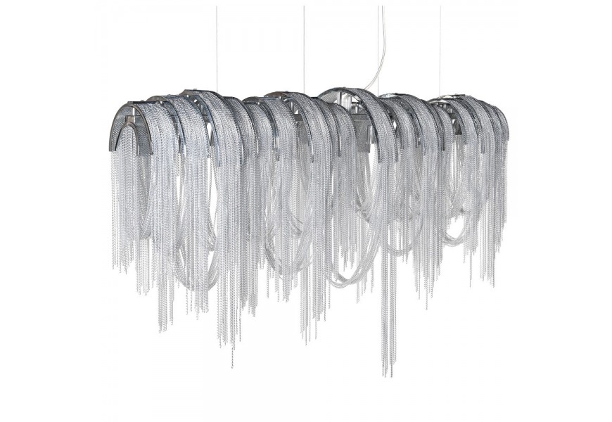 Štýlová závesná lampa Agadir je ideálnym kúskom pre tých, ktorí do svojho interiéru hľadajú elegantné a jedinečné svietidlo. Striebornú konštrukciou z kovu dopĺňa detailné retiazkovité zdobenie vytvárajúce dojem vodopádov. Padajúce strieborné retiazky vytvárajú nádherný luxusný vzhľad, ktorý vkusne doplní priestory obývačiek, jedální či vstupných hál. Závesná lampa Agadir vďaka svojmu originálnemu dizajnu vynikne v priestranných luxusných súkromných interiéroch, ale aj exkluzívnych hotelových halách či reprezentatívnych firemných priestoroch. Do lampy je potrebných päť žiaroviek typu G9 max 40W.