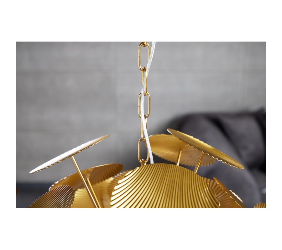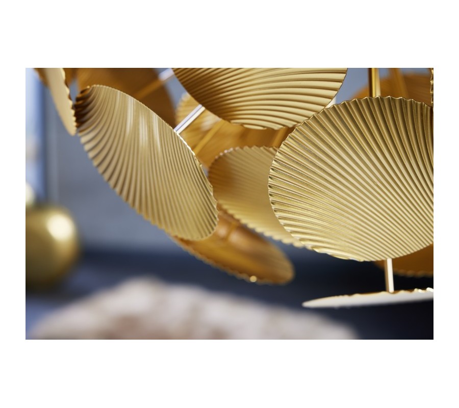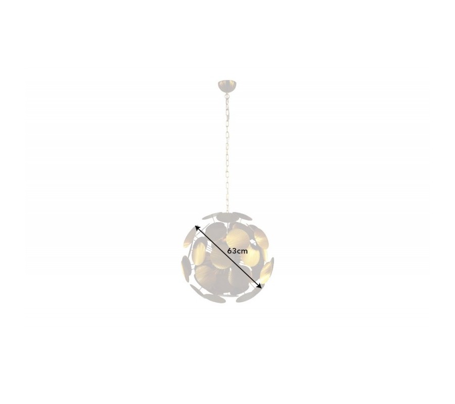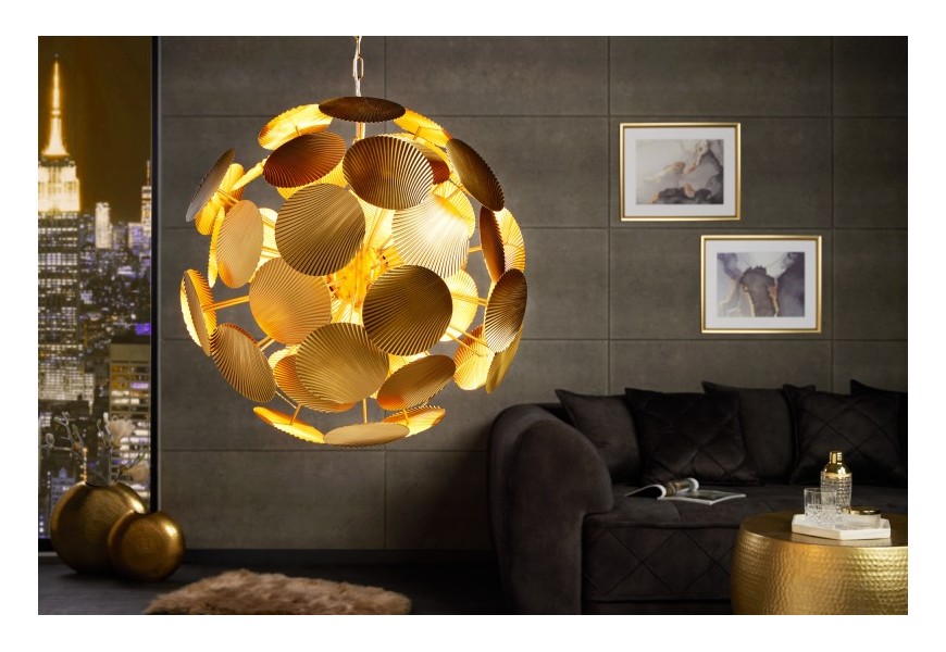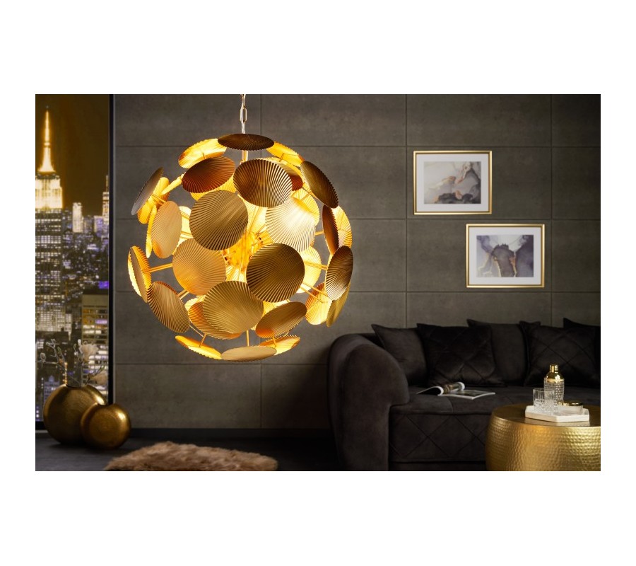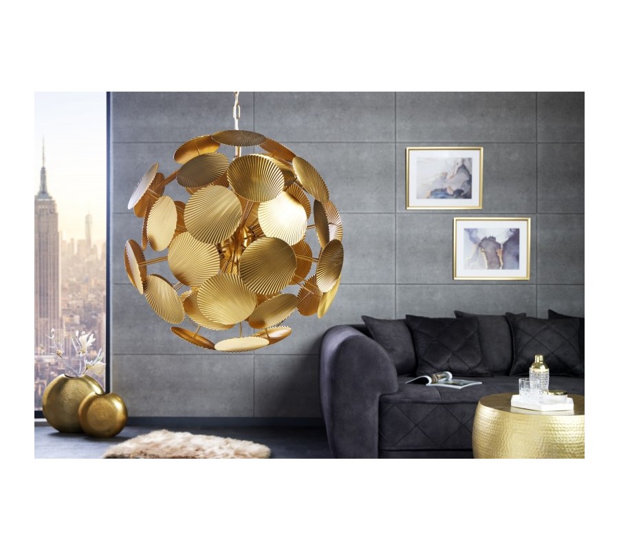 Luxusná závesná lampa Globe príjemne doladí priestory moderných i art deco ladených interiérov. Okrúhly dizajn pozostáva z kovovej konštrukcie upevnenej na závesnej reťazi, ktorú tvoria zlaté okrúhle pliešky s jemným zdobením. Celá konštrukcia sa nesie v žiarivej zlatej farbe, vďaka čomu nádherne doplní i tmavšie ladené priestory jedální, obývačiek, pracovní či iných miestností. Závesná lampa Globe svojou farebnou a materiálovou kombináciou dostáva luxusný glamour vzhľad, ktorý efektne vynikne vo vašich priestoroch. Kovové pliešky jemne stlmia svetlo a vytvoria unikátny a nadčasový dizajn. Lampa Globe nádherne doplní luxusné priestory zariadené skleneným či kovovým nábytkom, sedačkou so zamatovým alebo koženým čalúnením a ďalšími doplnkami nesúcimi sa v štýle art deco. Do lampy je potrebných 6 žiaroviek typu E14 max 40W.