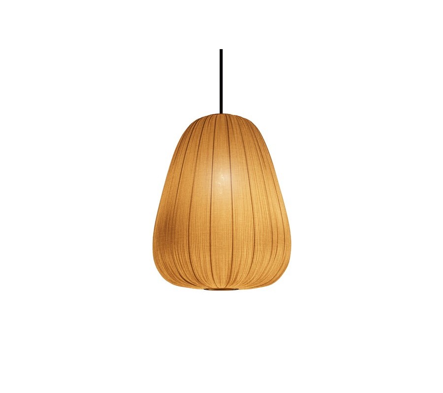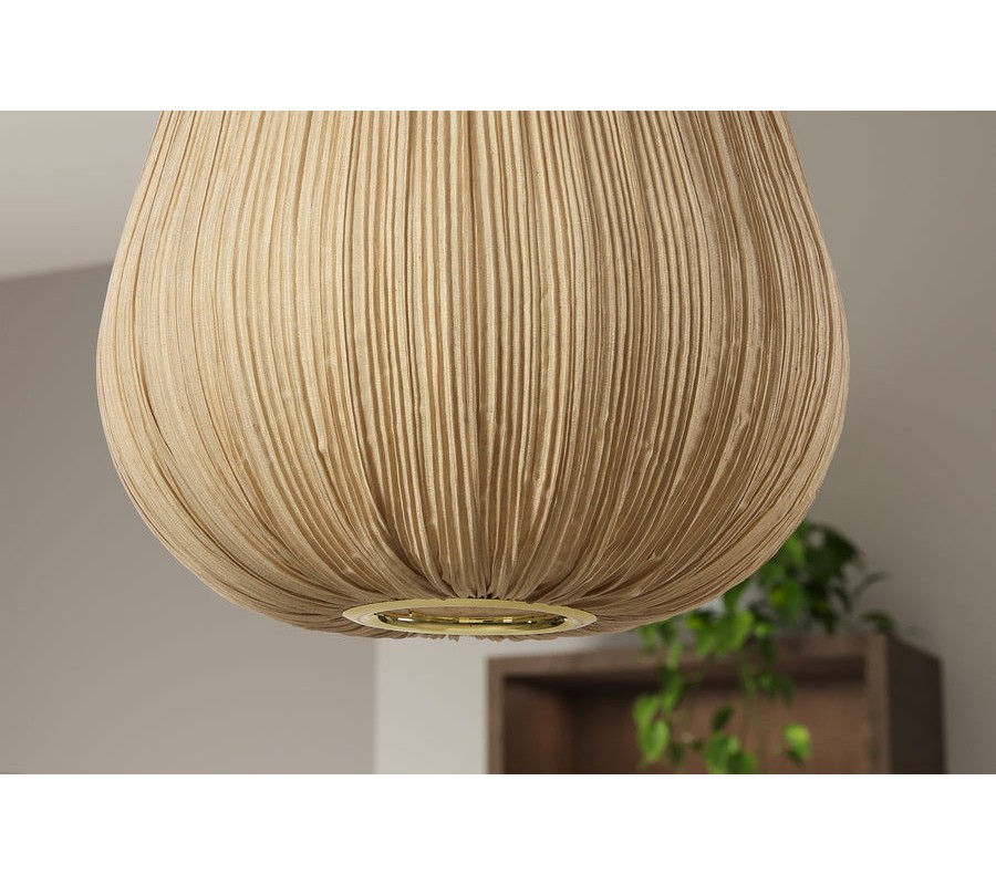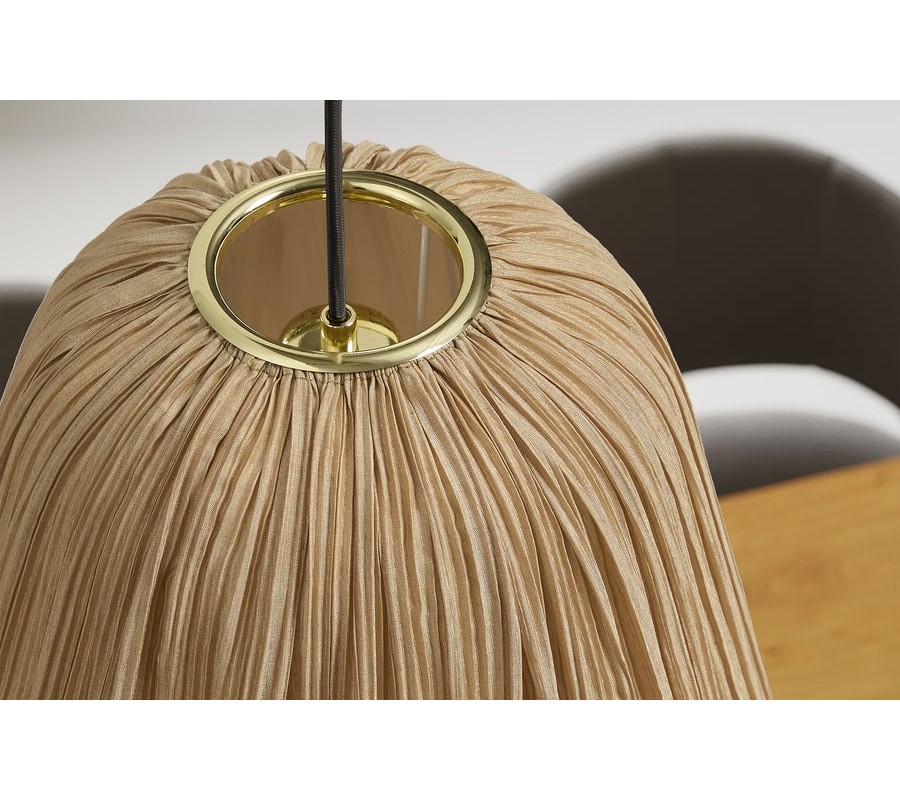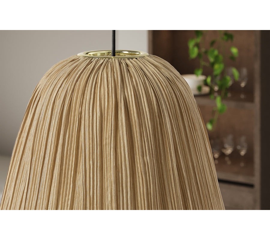 Lampa má tienidlo s okrúhlym pôdorysom. Jeho tvar je pretiahnutý do výšky a vo vrchnej časti zúžený. Elegantný zaoblený tvar dopĺňa textília v béžovej farbe, pretkaná jemným zlatým vláknom. Jeho odlesky zdôrazňujú skladaný dizajn pripomínajúci lampión a vytvárajú bohatý vizuál.