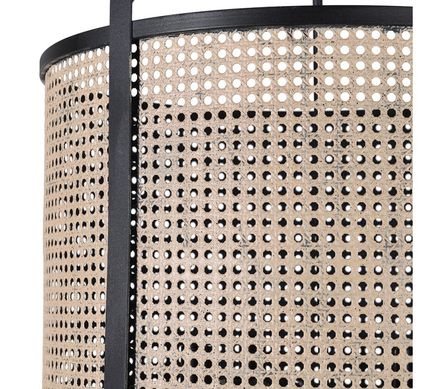 Industriálna čierna okrúhla závesná lampa Ravel s béžovým efektom ratanového výpletu z kovu 55 cm