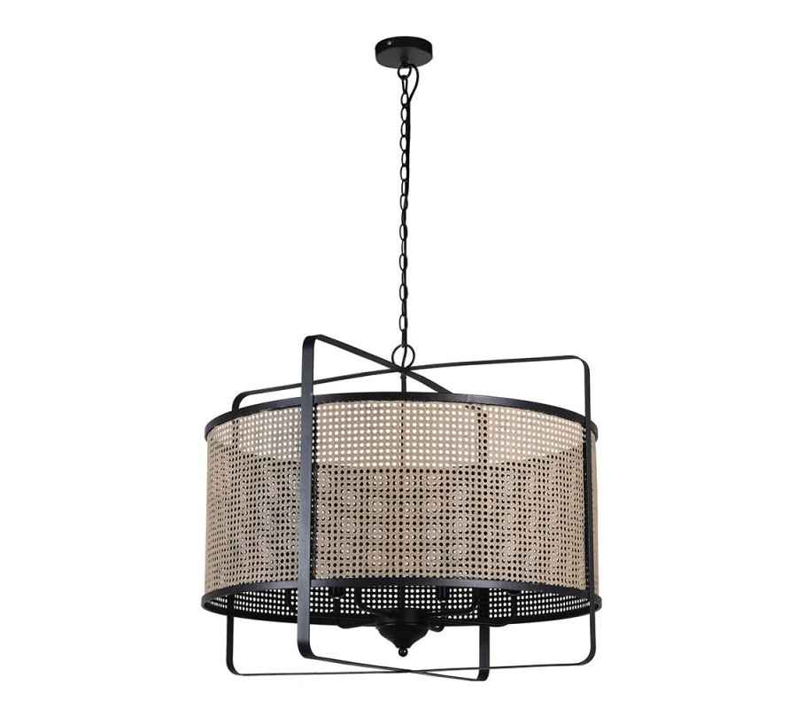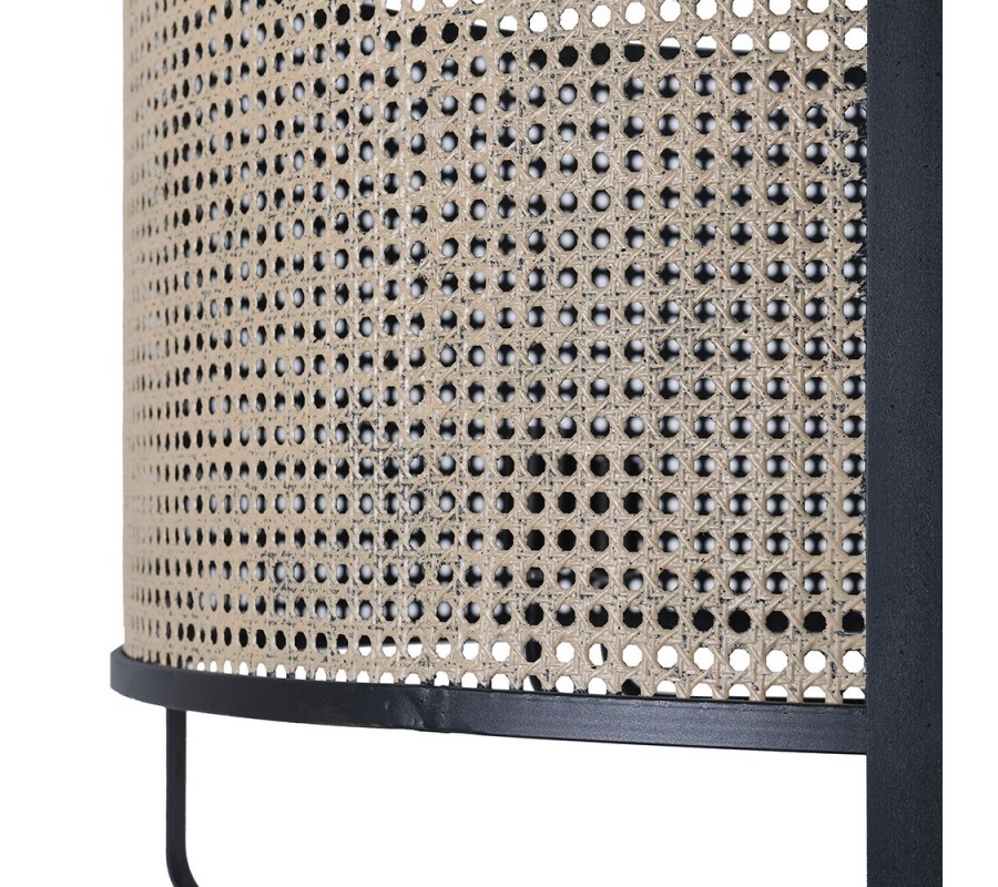 Celé tienidlo obopína štíhla obdĺžniková konštrukcia z čierneho kovu, ktorá lampu tvarovo rámuje a dodáva jej typický industriálny charakter. Kostra pozostáva z tenkých línií, ktoré prechádzajú po bokoch lampy a pretínajú sa v elegantnom geometrickom vzore. Horný a spodný kovový rám uzatvárajú výplet, čím zdôrazňujú tvar tienidla a zároveň zaisťujú maximálnu pevnosť. Kombinácia čierneho a béžového kovu vytvára zaujímavý kontrast, ktorý pôsobí elegantne a vyvážene.