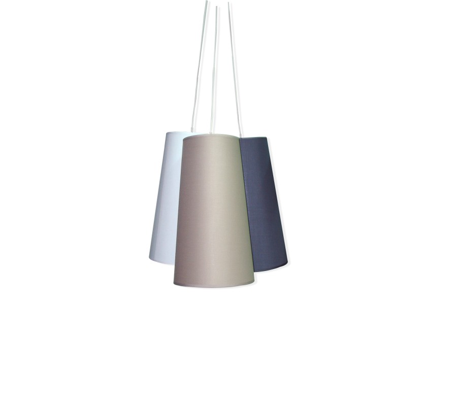 Každé tienidlo má iný odtieň – sivú, svetlomodrú a tmavomodrú, ktoré spolu vytvárajú harmonický kontrast. Povrch tienidiel je textilný, čo zabezpečuje mäkký rozptyl svetla a dodáva celkovému vzhľadu príjemnú textúru. Používajú sa tri žiarovky typu E14, ktoré sú ukryté vo vnútri jednotlivých častí, čím zabezpečujú rovnomerné osvetlenie.