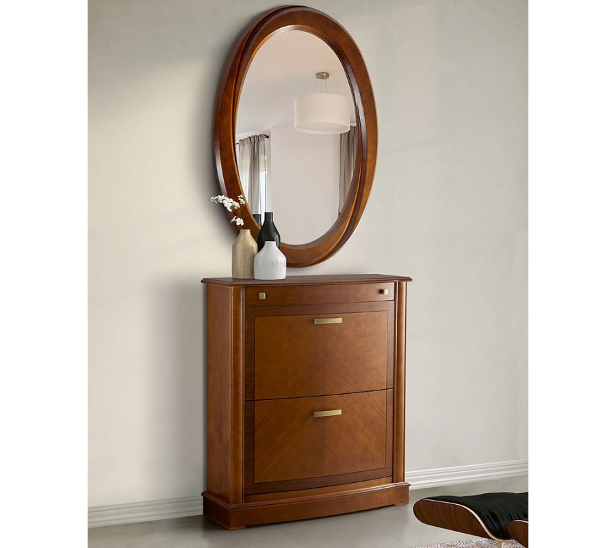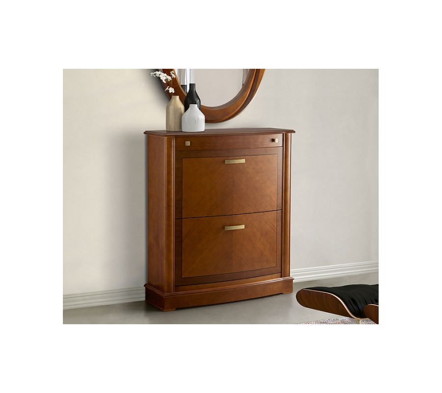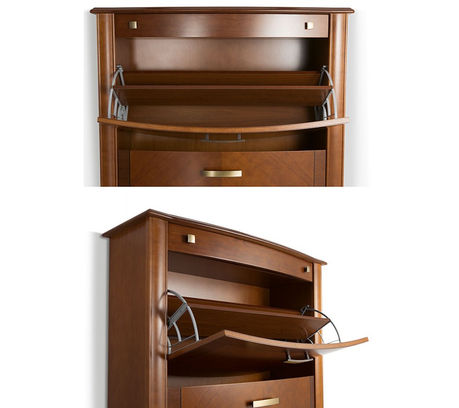 Luxusný botník Carmen je vyrobený z masívneho orechového alebo čerešňového dreva v rustikálnom štýle. Povrchová úprava tohto kúsku zvýrazňuje prirodzenú štruktúru dreva a dodáva mu naturálny nádych. Vďaka jednoduchosti dizajnu a rovným líniám sa hodí ako do rustikálnych, tak aj do moderných interiérov a ulichotí každému milovníkovi interiérového dizajnu. Disponuje štyrmi otvárateľnými poličkami a zásuvkou vo vrchnej časti. Dvierka a predná strana sú vyhotovené v jemno oblúku. Dvierka na prednej strane botníka sú vyzdobené obrazcom vyskladaným zo smerovania letokruhov dreva sústredených k úchytkám, čo dodáva botníku historický vzhľad. Okraje dvierok sú ohraničené linkou tmavšieho dreva, čo spolu s úchytkami zlatej farby dodáva botníku starožitný nádych. Botník Carmen odporúčame kombinovať napríklad so zrkadlom rovnakej kolekcie ale aj sklenými alebo kovovými dekoráciami.