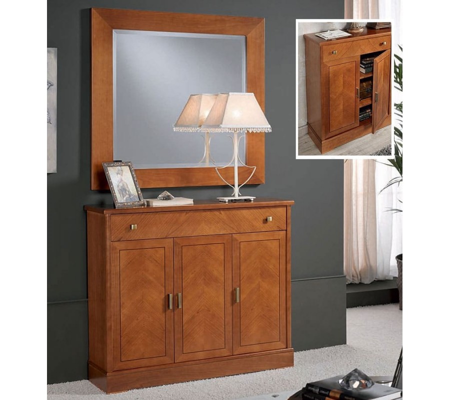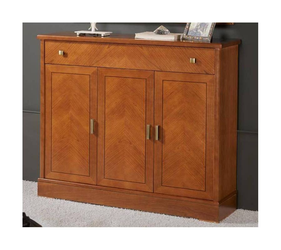 Luxusná komoda Carmen vynikne v rustikálne ladených interiéroch, najmä vďaka zdobeniu dvierok po ich okrajoch a motívu letokruhov dreva, ktoré smerujú do stredu dvierok a dodávajú tejto komode starožitný nádych. Dominantou tejto komody je povrchová úprava, ktorá zvýrazňuje naturálnu štruktúru dreva. Komodu Carmen je možné vyrobiť z masívneho dreva chráneného kvalitnou dyhou v prevedení čerešňa alebo orech. Kovové úchytky starozlatej farby na dvierkach a zásuvke, v kombinácií s hnedou farbou masívneho dreva, dotvárajú luxusný nádych tohto rustikálneho kúsku. Komoda Carmen disponuje dostatkom úložného priestoru v podobe vnútorných poličiek a zásuvky vo vrchnej časti. Odporúčame ju kombinovať s ostatným nábytkom kolekcie Carmen, ako napríklad s rustikálnym masívnym zrkadlom, ale aj dekoráciami v zlatej farbe.