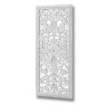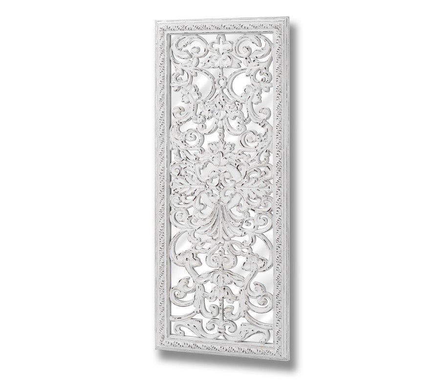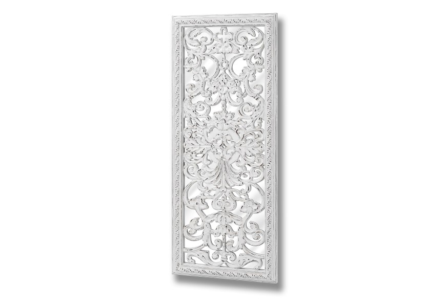 Štýlové dekoračné zrkadlo tvorí bohato vyrezávaný drevený rám v bielej farbe s patinou, ktorý je posadený na zrkadlovom podklade. Tento výrazný kus nábytku upúta pohľady hostí a stane sa neprehliadnuteľnou súčasťou interiéru. Vhodné je najmä do luxusne zariadených priestorov s prvkami provensálskeho štýlu.