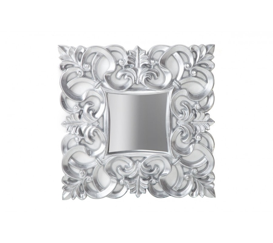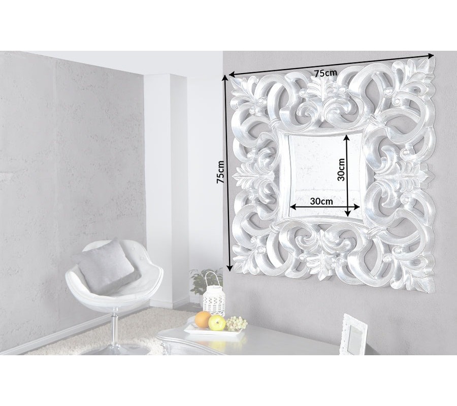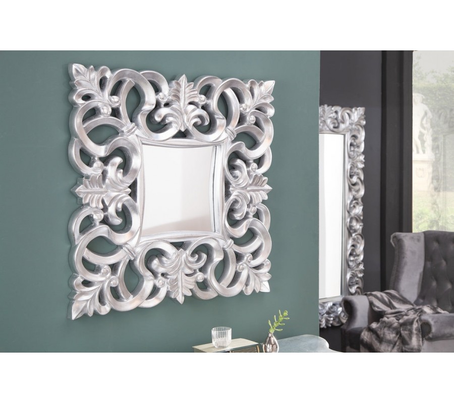 Glamour štvorcové nástenné zrkadlo Venice so strieborným ozdobným rámom s plastickým vzorom v klasickom štýle 75 cm