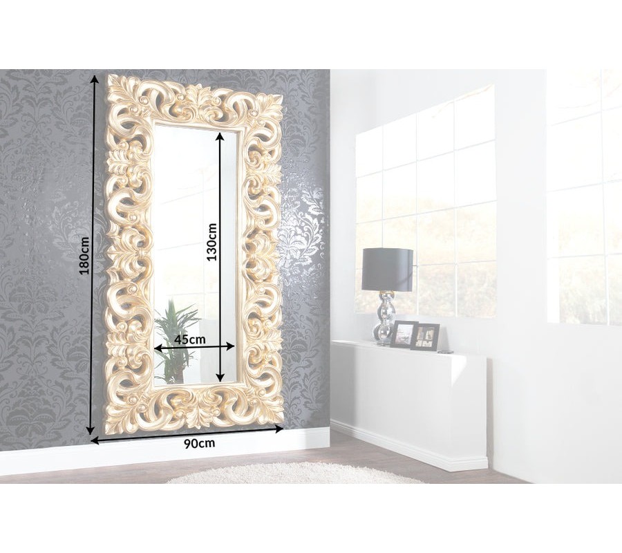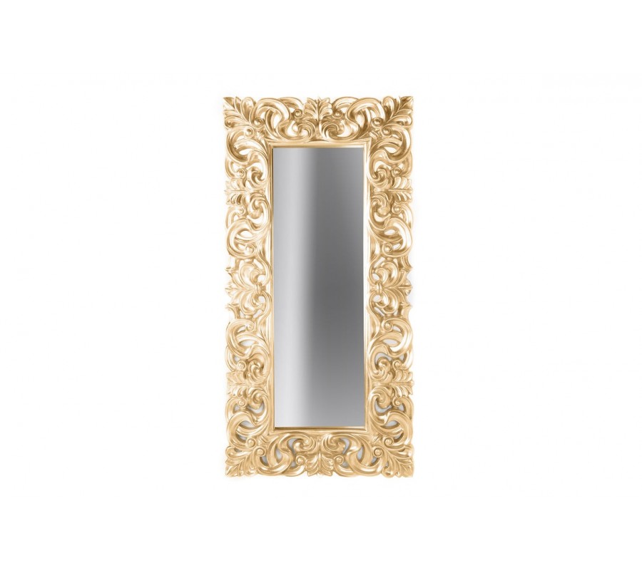 Zrkadlo Venice v glamour štýle je luxusným interiérovým doplnkom, ktorý okamžite pritiahne pohľady. Jeho vysoký obdĺžnikový tvar opticky predlžuje priestor a zároveň dodáva eleganciu každej miestnosti. Dominantou je výrazný rám v zlatej farbe, bohato zdobený barokovými ornamentmi, ktoré pripomínajú točené listy, kvetinové špirály a prepletené výhonky.