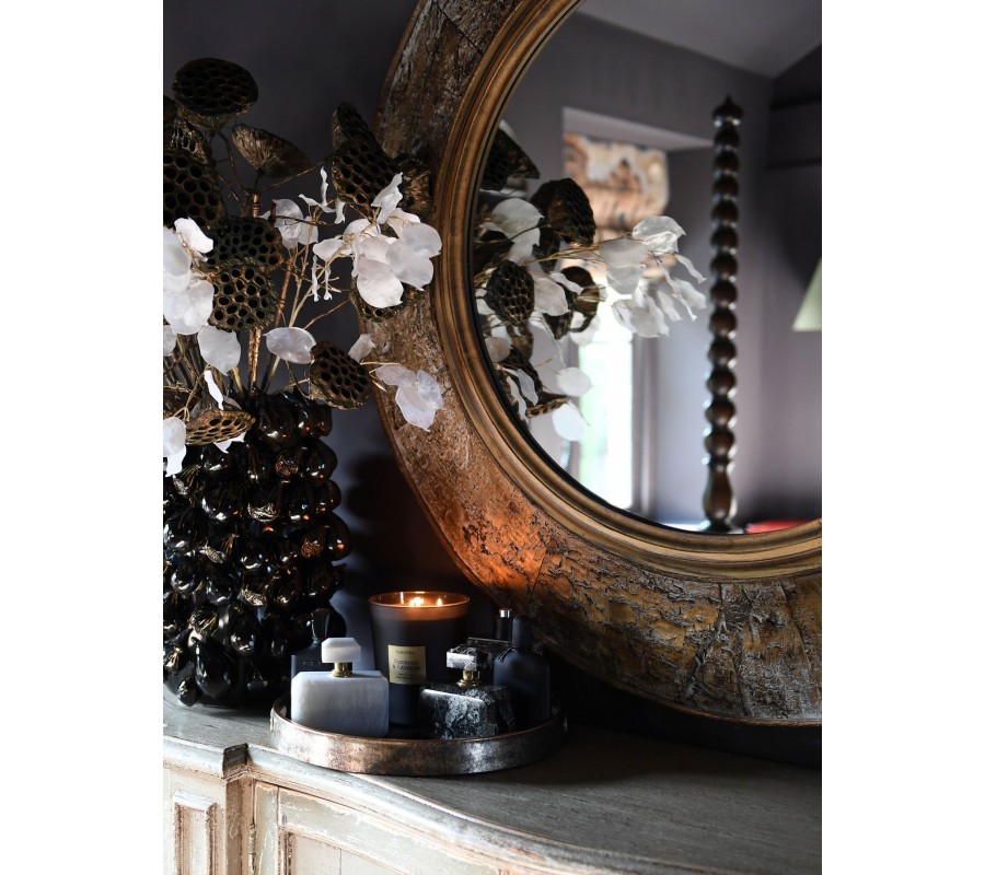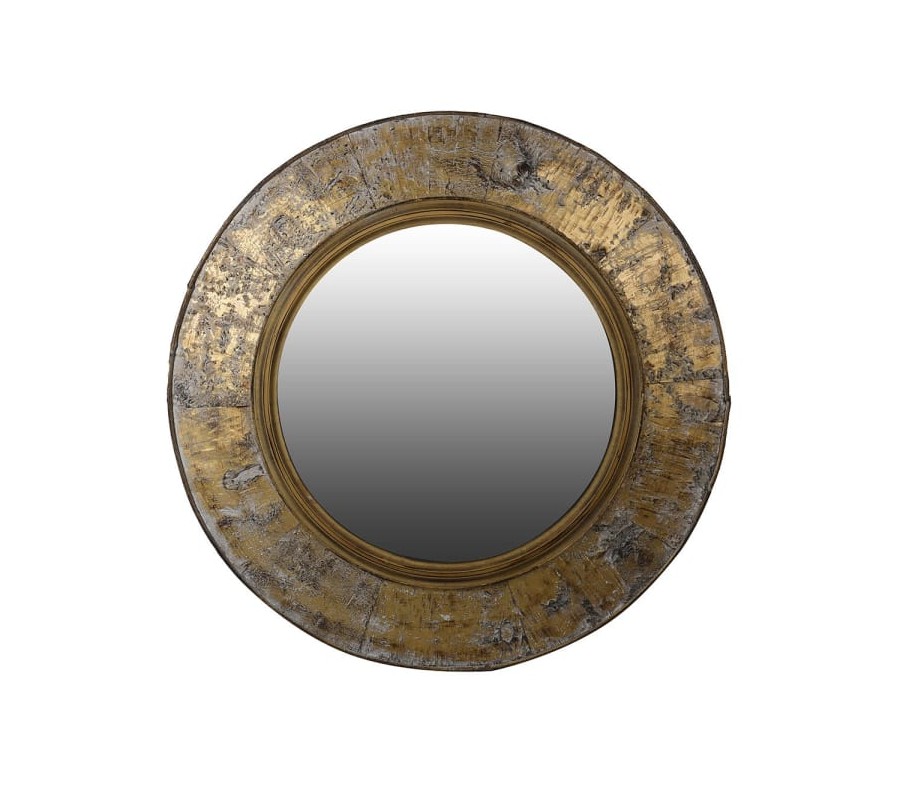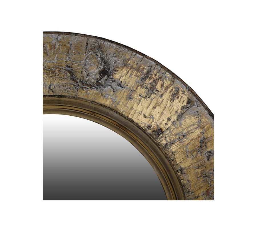 Zrkadlo Los je dekoratívny vintage kúsok s výrazným rámom, ktorý zaujme originálnou textúrou a luxusným nádychom. Jeho okrúhly rám pôsobí robustne a je pokrytý nerovnomerným zlatým náterom, ktorý pripomína prirodzenú štruktúru brezovej kôry. Povrch rámu má autentický, mierne ošúchaný vzhľad, ktorý zrkadlu dodáva umelecký a historický charakter.