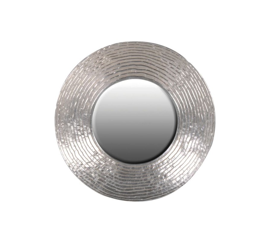 Kruhové zrkadlo Zania s hladkým stredom a výrazným dekoratívnym rámom je jedinečným dizajnovým prvkom. Rám je štruktúrovaný pravidelnými líniami, ktoré pripomínajú vrstvenie, a jeho povrch je upravený lesklou metalickou striebornou farbou.