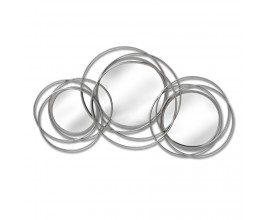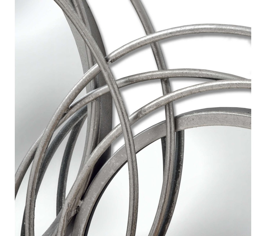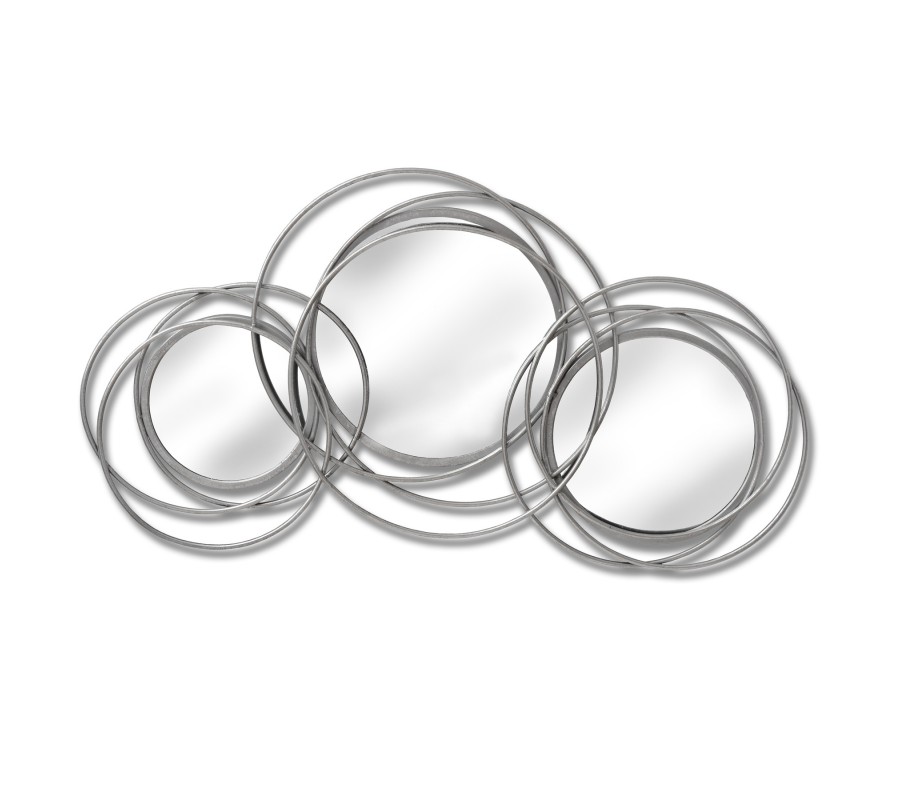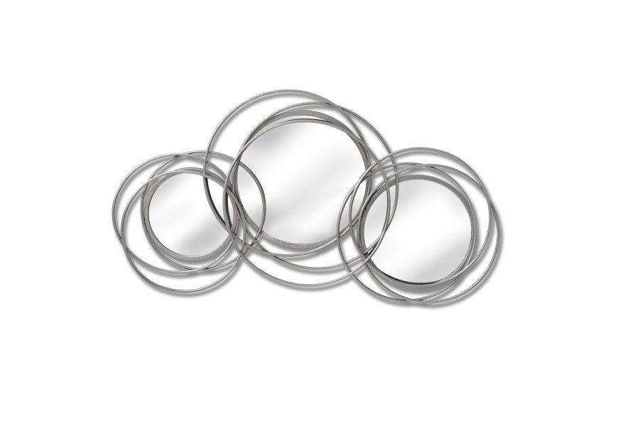 Štýlový set troch nástenných okrúhlych zrkadiel v jedinečnom dizajne je unikátny kúsok do vašej domácnosti. Rám zrkadla je ručne vyhotovený z kovových strieborných nepravidelných kružníc nadobúdajúcich dojem prepletených konárov či kovových vencov. Zrkadlá odporúčame kombinovať so striebornými doplnakmi do predsiení, obývačiek či izieb s bielym nábytkom, kde ozvláštnia interiér a očaria vašich hostí.