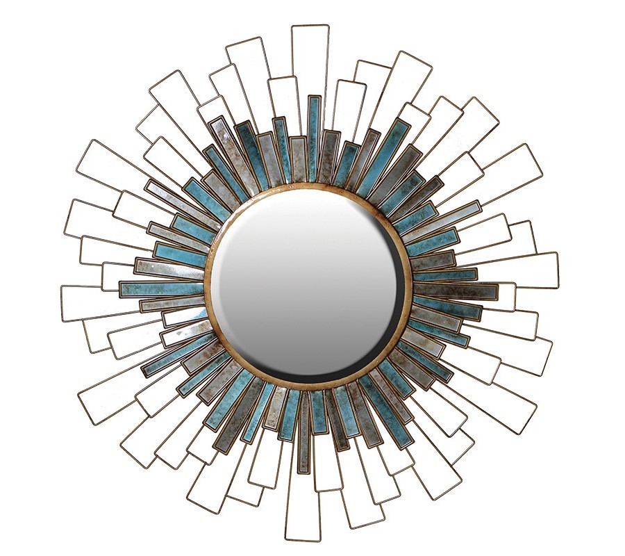 Zrkadlo Satordi v etno a orientálnom štýle predstavuje pôsobivý doplnok s výraznou dekoratívnou hodnotou. V jeho strede sa nachádza okrúhla zrkadlová plocha, ktorú obklopujú farebné sklenené segmenty v tónoch modrej a sivej, zasadené do zlatej kovovej konštrukcie v tvare slnečných lúčov.