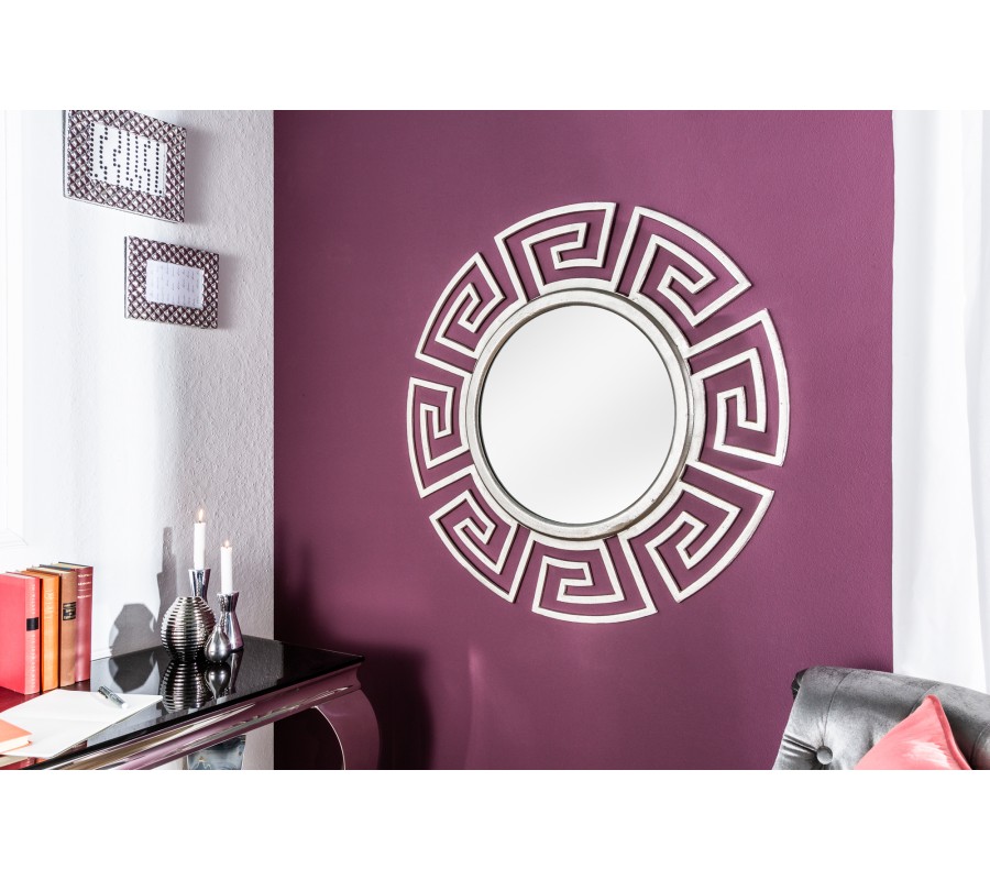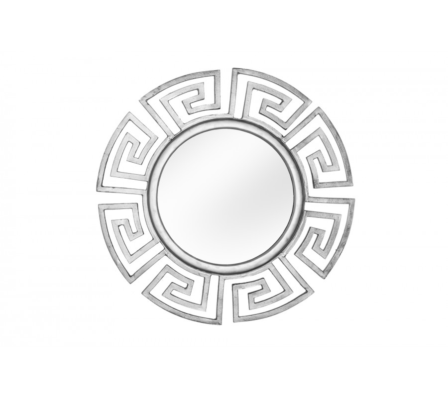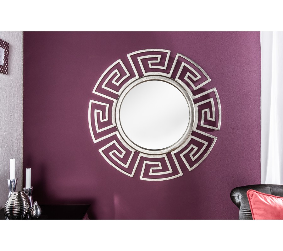 Art deco okrúhle nástenné zrkadlo Euphoria so strieborným kovovým rámom s geometrickým gréckym vzorom 85 cm