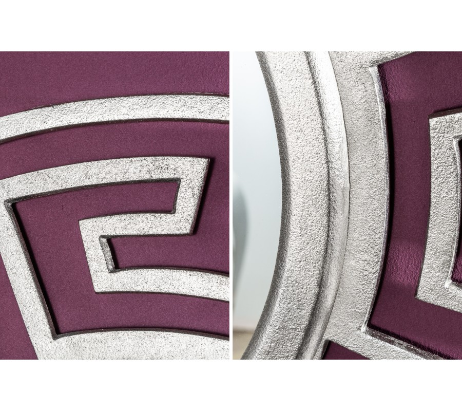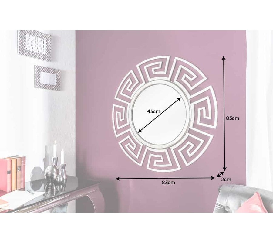 Zrkadlo Euphoria je štýlový doplnok v duchu art deco, ktorý okamžite upúta pozornosť svojím okrúhlym tvarom a výrazným rámom zo strieborného kovu. Dominantný dekoratívny vzor rámu pozostáva z pravidelne opakujúcich sa geometrických motívov typu meander, ktoré sú typické pre starovekú grécku ornamentiku. Tieto ostré línie a uhlové zatočenia vytvárajú dynamický dojem a symbolizujú nekonečnosť a kontinuitu.