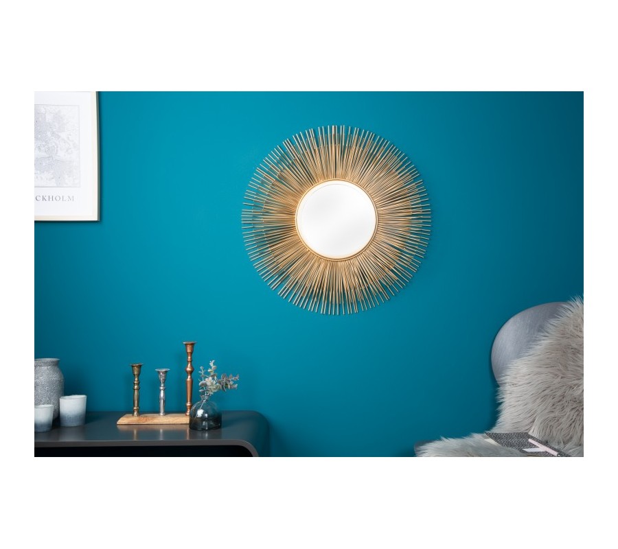 Exkluzívne okrúhle zrkadlo Dorset na prvý pohľad zaujme svojim neprehliadnuteľným kovovým rámom v tvare slnka. Zrkadlo Dorset predstavuje jedinečný a dizajnový kúsok, ktorý nesmie chýbať v žiadnej moderne zariadenej domácnosti. K dispozícii v zlatom a striebornom farebnom prevedení.