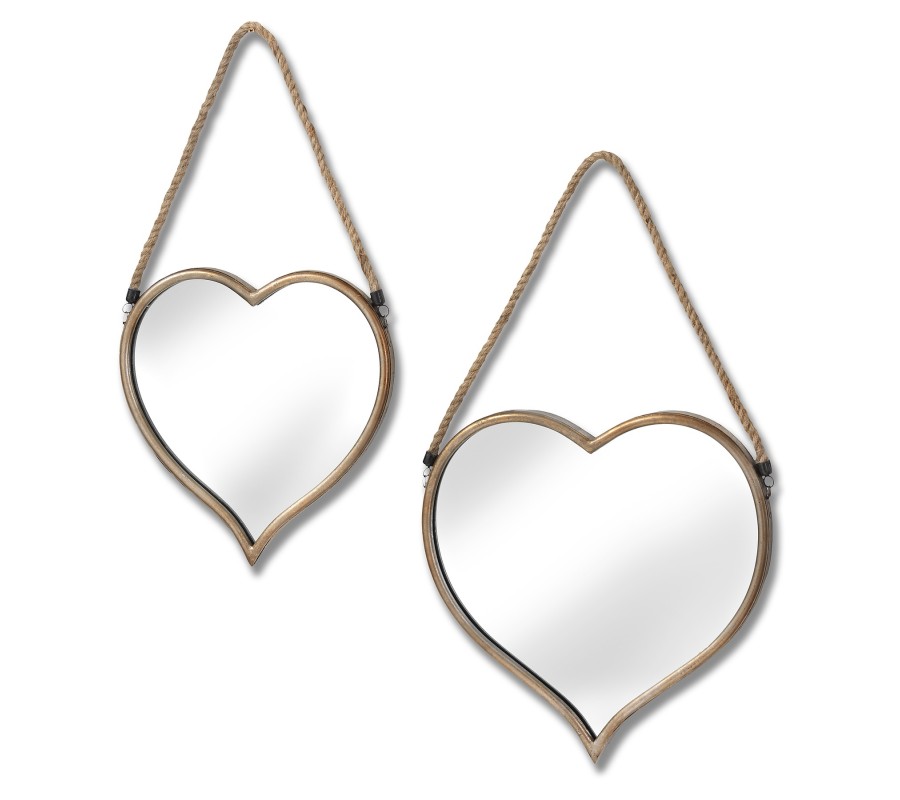 Sada dvoch závesných nástenných zrkadiel Heart prinesie do interiéru jemný nádych romantiky a nostalgie. Každé zrkadlo má výrazný tvar srdca a je zasadené do kovového rámu v zlatej farbe s jemnou patinou, ktorá zrkadlám dodáva charakteristický vintage vzhľad.