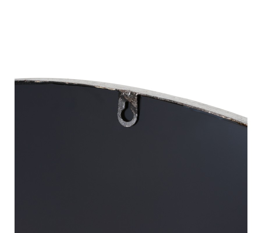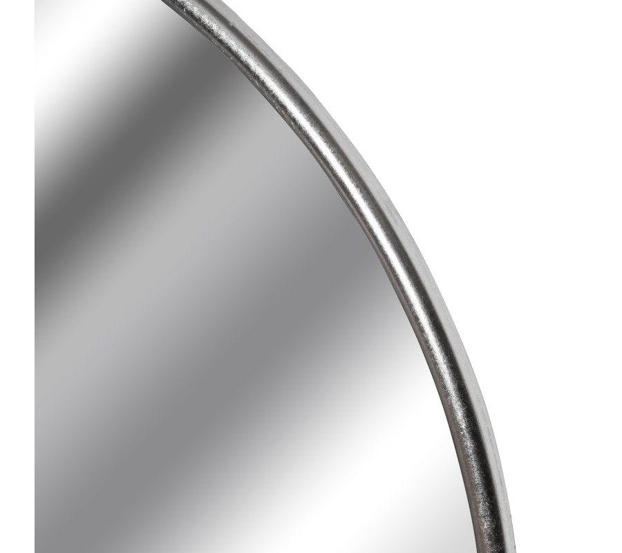 Zrkadlo má pravidelný geometrický okrúhly tvar s veľkou reflexnou plochou a štíhlym kovovým rámom. Zadná strana je čierna a obsahuje vo vrchnej časti háčik na zavesenie na stenu. Rám má zaoblený profil a metalické strieborné prevedenie. Povrch má jemnú pórovitú štruktúru, ktorá ho mierne zmatňuje.