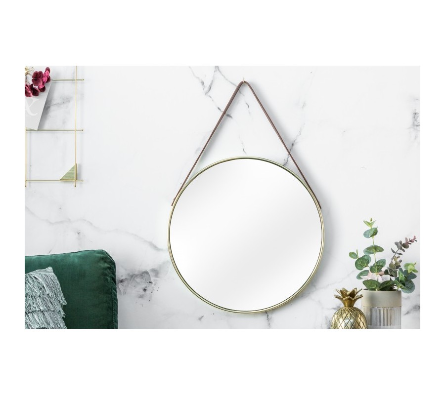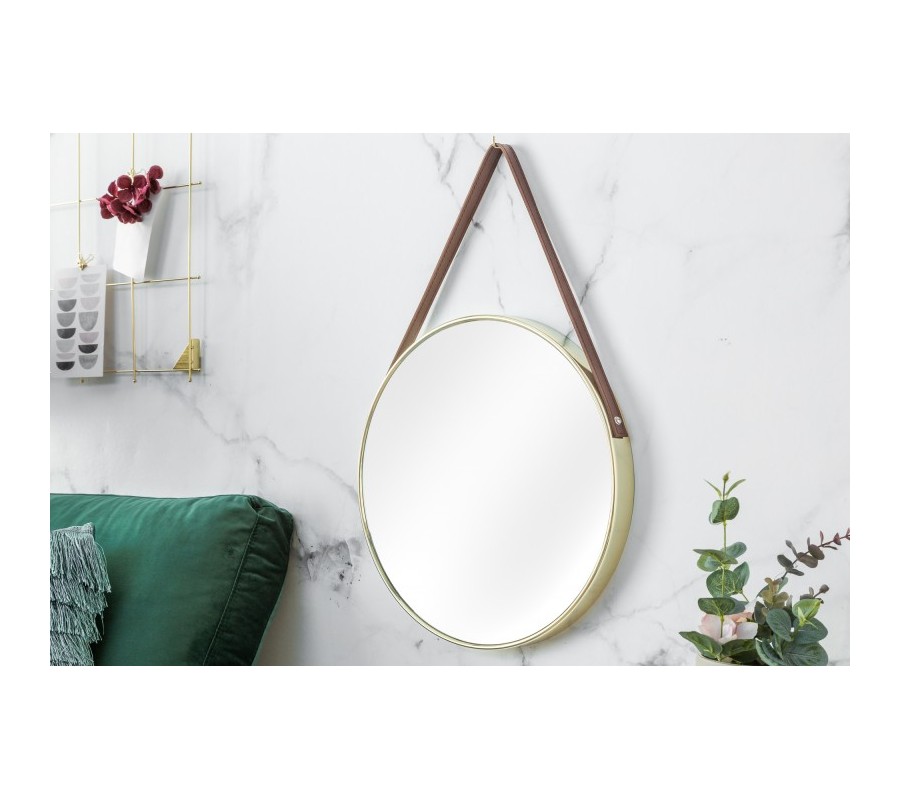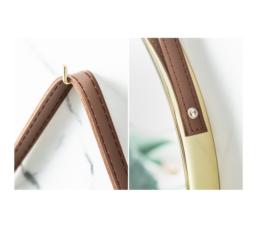 Exkluzívne závesné zrkadlo Minna vďaka svojmu jednoduchému dizajnu skvelo zapadne do industriálne zariadených priestorov, ale i do modernej minimalistickej domácnosti. Kruhový tvar so zlatým kovovým rámom sa bude krásne vynímať na bielej či farebnej stene a dá sa jednoducho kombinovať aj s inými štýlmi či farbami. Na zavesenie slúži hnedý koženkový remienok, ktorý dotvára jedinečný dizajn celého kúsku.