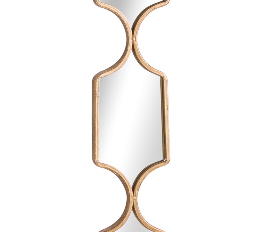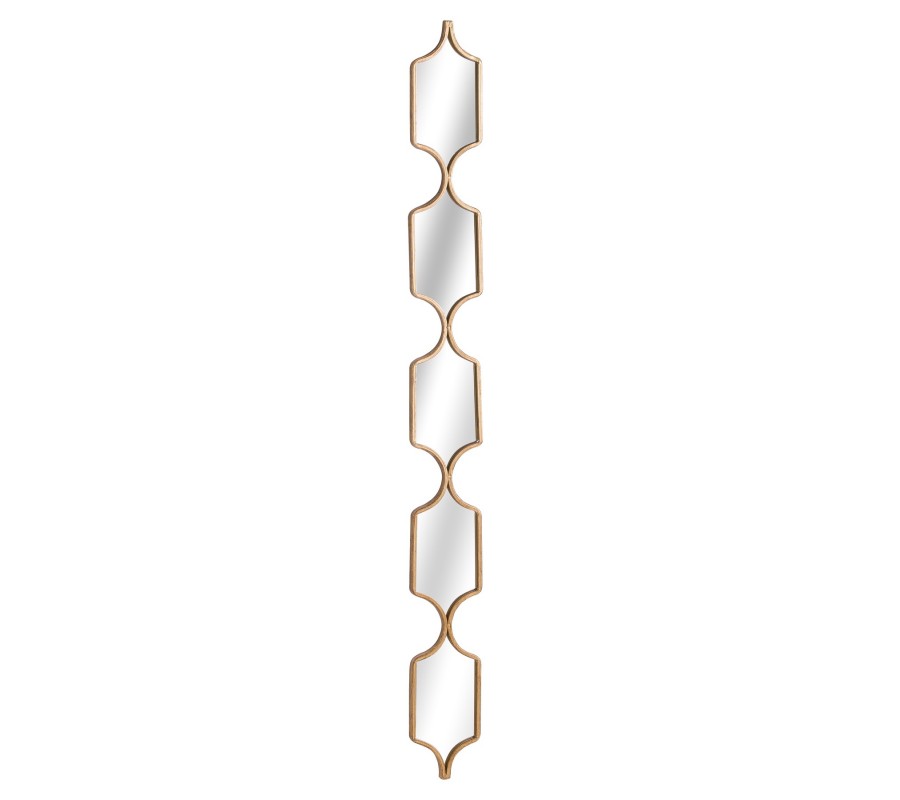 Dizajnové zrkadlo Aspai Gold je zložené z piatich štýlovo tvarovaných prepojených zrkadlových častí, ktoré spolu vytvárajú jeden celok. Tento dizajnový atypický tvar a zlatý kovový rám dodáva zrkadlu art-deco nádych, ktorý skvelo obohatí stenu vašej obývačky, spálne, chodby či predsiene. Zaujímavý výsledok možno dosiahnuť aj umiestnením dvoch či troch zrkadiel vedľa seba. Zrkadlo Aspai Gold váš interiér zaručene ozvláštni a skvelo vynikne v kombinácii s rôznymi art-deco doplnkami, farebnými kobercami či dizajnovými kovovými svietidlami.