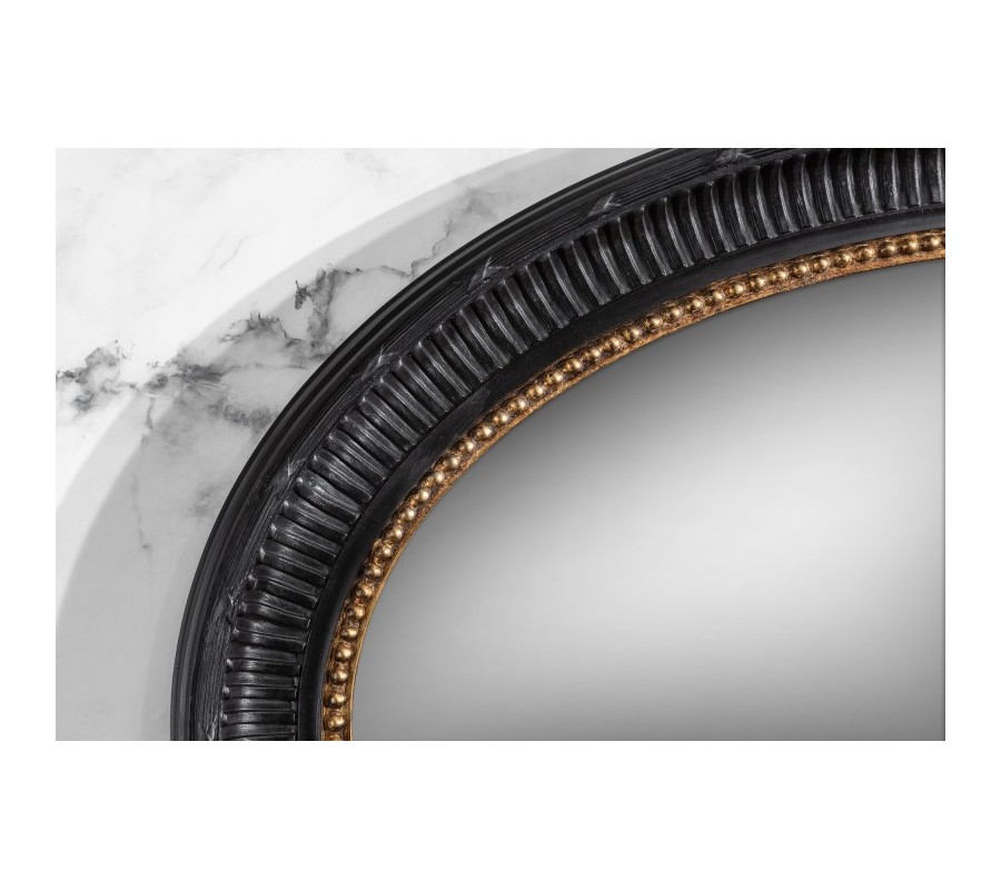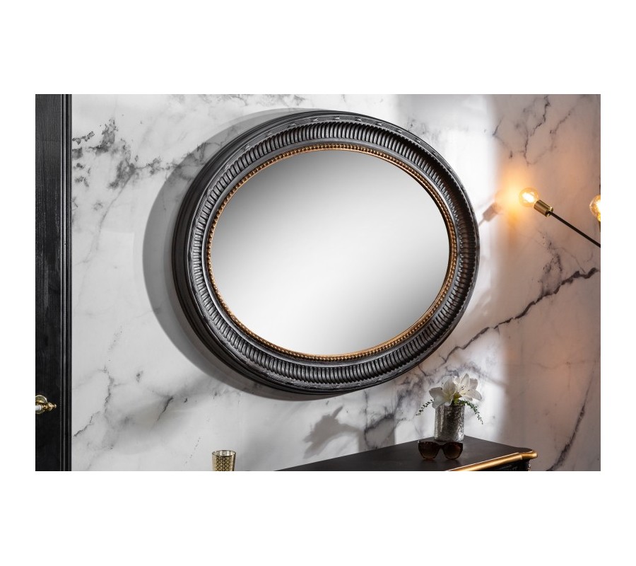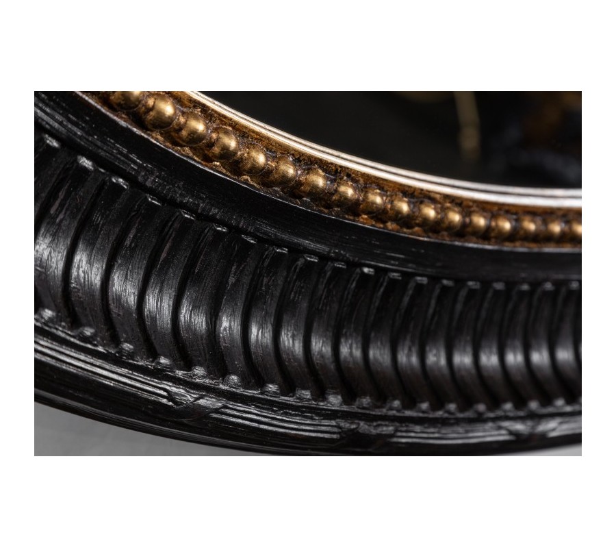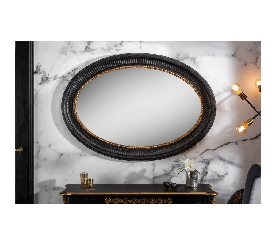 Štýlové závesné zrkadlo Windham s oválnym masívnym rámom sa stane dokonalým doplnením interiérov s masívnym nábytkom so starožitným povrchom či vintage efektom. Hrubý rám v kontrastnom čiernom prevedení sa stane stredobodom každého priestoru. Vyrezávanie a detaily v zlatom prevedení mu dodávajú luxusný barokový nádych. Nástenné zrkadlo Windham môžete kombinovať s luxusným masívnym nábytkom v rozličných odtieňoch, nestratí sa ani na stene s výraznou farebnou a vzorovanou tapetou.