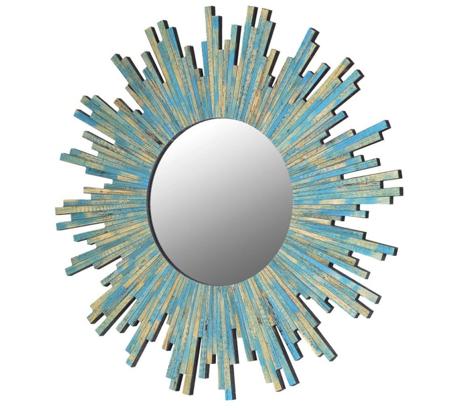 Štýlové nástenné zrkadlo Minne je jedinečným a dizajnovým kúskom, ktorý rozžiari každú miestnosť! Vynikne predovšetkým na bielych stenách vďaka jedinečnému drevenému rámu v modrom odtieni. Rám zrkadla Minne je tvorený jednotlivými lúčovými tvarmi, čo vytvára unikátny dizajn. Elegantný kruhový tvar zapadne všade a krásne doplní priestory vašej obývačky, spálne či chodby.