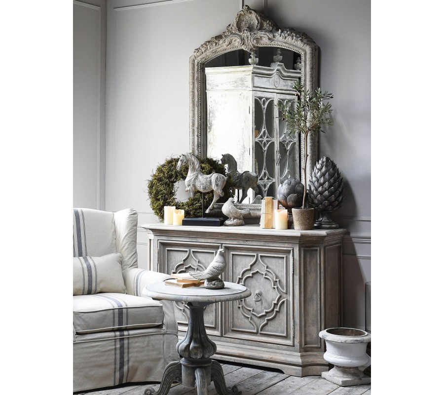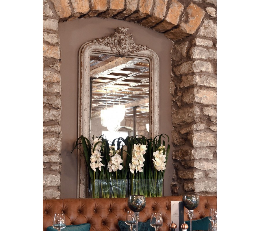 Šatníkové zrkadlo predstavuje kombináciu provensálskeho a vintage štýlu, toto prepojenie dodáva zrkadlu zaujímavý vzhľad, ktorý upúta každého pozornosť. Rám z masívneho dreva sa prelína v jemnejších farebných tónoch z masívneho dreva, čím dodáva pocit luxusu a elegancie nástenného zrkadla. Zrkadlo má podlhovastý tvar, z vrchu so zaobleným zakončením a zo spodu kontrastne s rovným zakončením. Na vrchnej časti rámu sa uprostred nachádza ozdobný detail zrkadla, ktorý pripomína výzdobu barokového starožitného nábytku. Na ráme môžeme vidieť krásnu ručne vyrezávanú plastiku listov. Okraj rámu je tiež zdobený drobnými reliéfnymi detailmi. Nástenné zrkadlo vynikne na stenách v jemných pastelových farbách a hodí sa do interiérov, ktoré sú zariadené vo vintage, alebo provensálskom štýle. Odporúčame nástenné zrkadlo umiestniť do spálne, alebo predsiene.