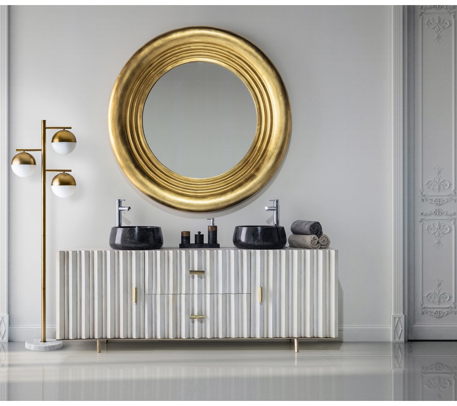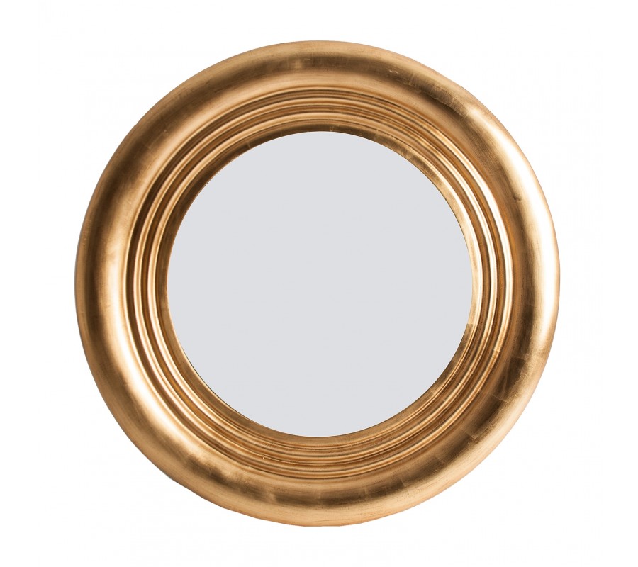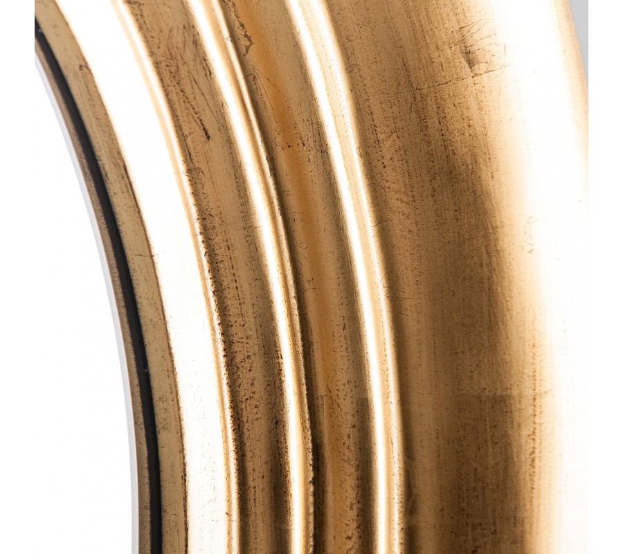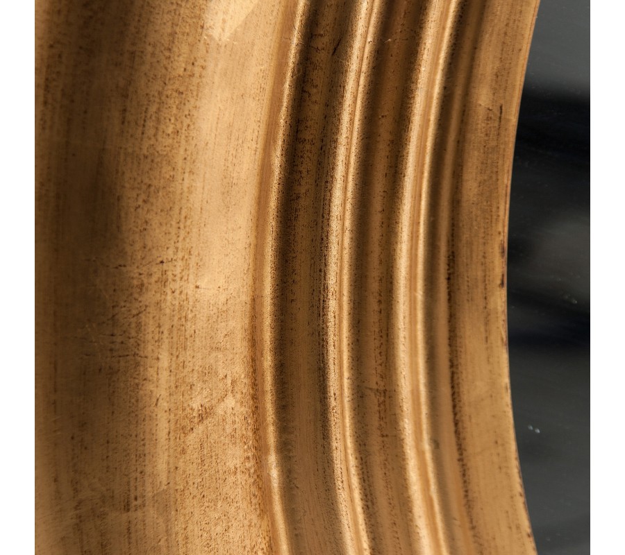 Okrúhle nástenné zrkadlo dominantne vyzdobí interiér vďaka mohutnému okrúhlemu rámu v zlatej farbe. Svojim priemerom sa zaraďuje medzi veľké zrkadlá, ktoré si nájdu svoje miesto v rôznych miestnostiach. Rám zrkadla je vyrobený z dreva mango a je na povrchu vyzdobený vrstvenými kruhmi v zlatej farbe. Zlatá farba na povrchu zrkadla nesie prvky zostarnutia v podobe jemných prasklín, ktoré sú typickým znakom pre vintage nábytok. Zrkadlo je vďaka jeho hrubému výraznému rámu v zlatej farbe vhodné do opulentne zariadených art-deco interiérov, jedálni ale aj do luxusných barov a reštaurácii a reprezentatívnych priestorov firiem.