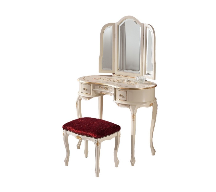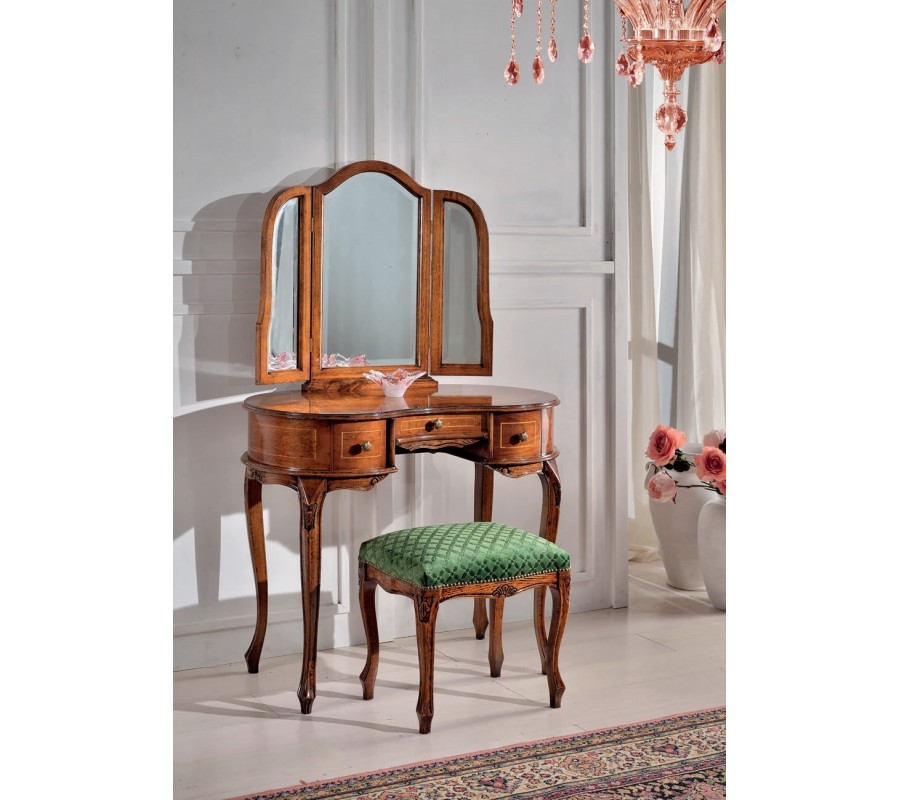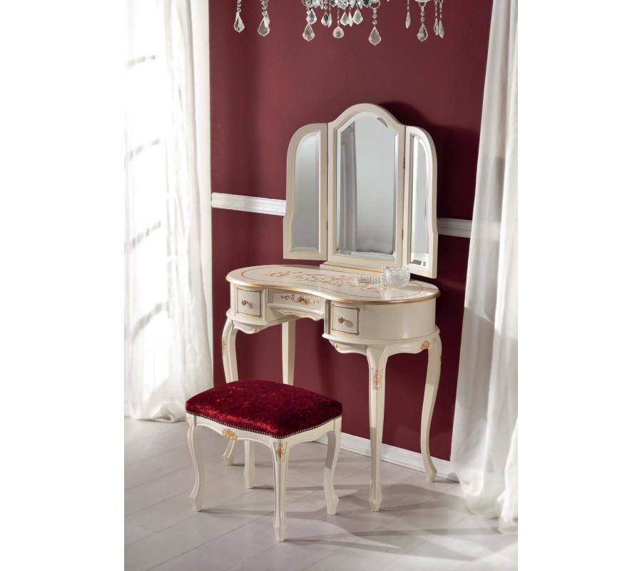 Unikátny toaletný stolík Clásica z našej rovnomennej kolekcie talianskeho nábytku je kúskom, ktorý krásne doplní každú klasicky či barokovo ladenú spálňu alebo obývačku. Zaujme najmä svojím oválnym tvarom a elegantným vzhľadom, ktorý je dosiahnutý kombináciou kvalitného masívneho dreva s bielou povrchovou úpravou so zlatým ornamentálnym zdobením. Zaoblené nožičky a detailné ručné vyrezávanie dodávajú stolíku nezameniteľný rustikálny nádych. Okrem originálneho vzhľadu vás toaletný stolík Clásica poteší aj svojím úložným priestorom v podobe troch praktických zásuviek s elegantnými kovovými rukoväťami. Súčasťou je taktiež štýlové zrkadlo s dreveným rámom v podobe triptychu s dominantou stredovou časťou a dvomi uzatvárateľnými krídlami. Na výber ponúkame niekoľko možných prevedení dreva, ktoré si môžete prezrieť v priloženom vzorkovníku. Toaletný stolík Clásica odporúčame kombinovať s masívnym nábytkom v podobnom štýle a s čalúnenou taburetkou či kreslom.