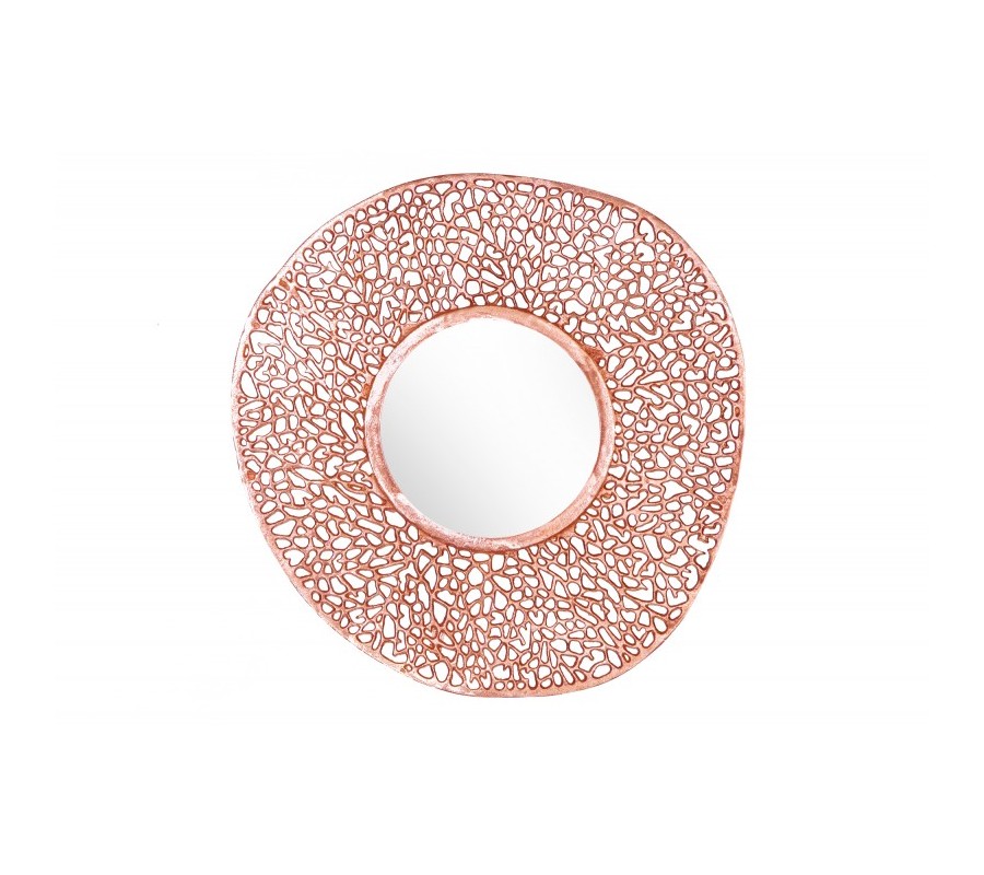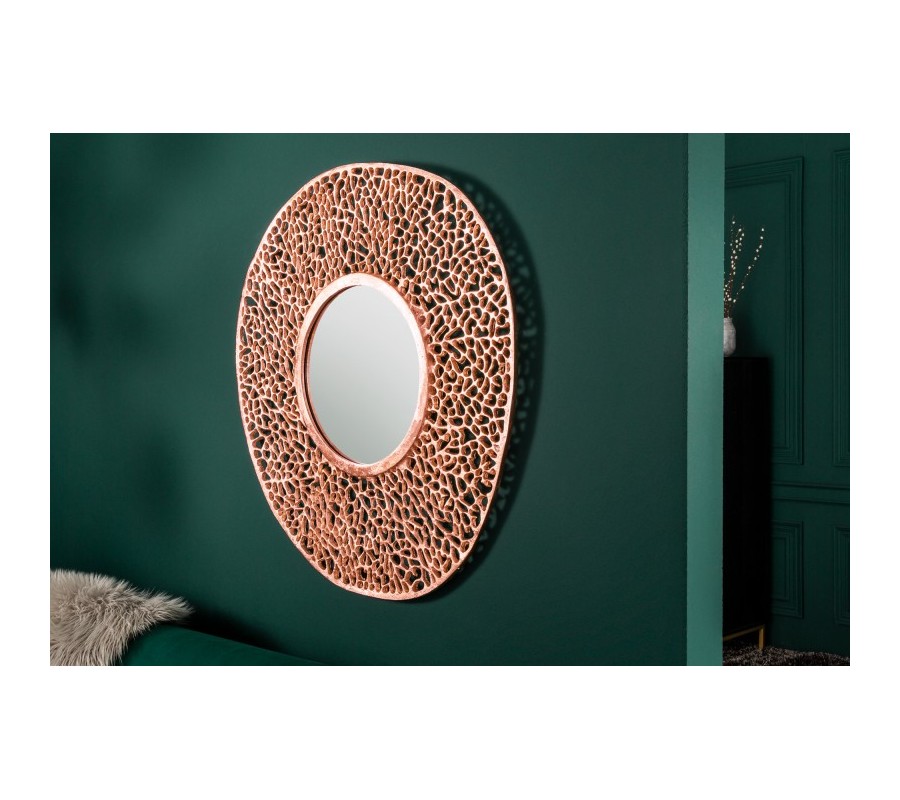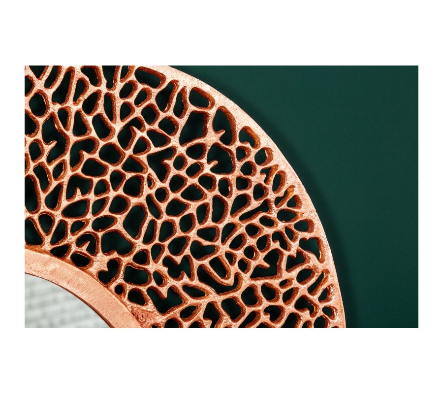 Dizajnové nástenné zrkadlo Hoja predstavuje prepojenie elegancie a nadčasového vzhľadu. Toto zrkadlo sa bude na vašich stenách vynímať najmä vďaka svojmu jedinečnému okrúhlemu rámu z kovu, ktorý sa nesie v príjemnej medenej farbe. Zaujímavá štruktúra rámu robí tento kúsok skutočne originálnym doplnkom vhodným do všetkých moderne či art-deco ladených priestorov. Odporúčame zrkadlo Hoja umiestniť na stenu kontrastnej farby v obývačke, na chodbe alebo v luxusnej pracovni, no svoje meisto si nájde aj v reprezentatívnych priestoroch firiem či hotelov. Vhodné farebné kombinácie sú napríklad smaragdovozelená, kráľovská modrá alebo čierna.