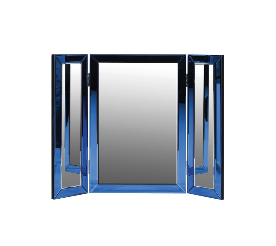 Dizajnové nástenné zrkadlo Senchi je vhodným kúskom pre všetkých milovníkov hravých a inovatívnych interiérových doplnkov. Pozostáva z troch obdĺžnikových častí- väčšej strednej časti a dvoch bočných, menších "krídel" vytvárajúcich tvar triptychu. Rám vyrobený z materiálu MDF je doplnený povrchovou úpravou so štýlovým zrkadlovým efektom, ktorý dodáva tomuto kúsku nezameniteľný nádych art deco štýlu. Rám sa nesie v nádhernej elektrickej modrej farbe, vďaka čomu zaujme už na prvý pohľad a poľahky upúta pozornosť. Tento kúsok možno doladiť do moderných a art deco ladených interiérov, kde vynikne napríklad v kombinácii s čalúneným kreslom či skleneným alebo zrkadlovým nábytkom. Odporúčame tiež dizajnové kovové dekorácie v strieborných, čiernych alebo zlatých odtieňoch.