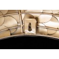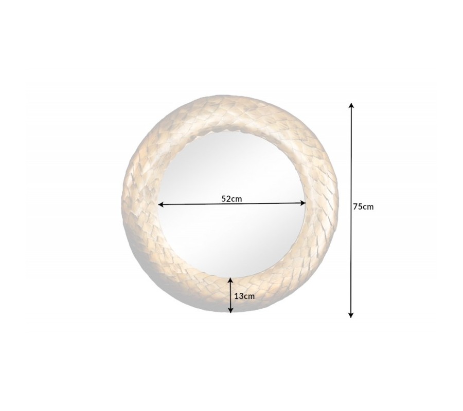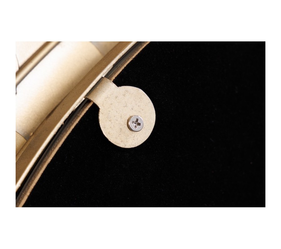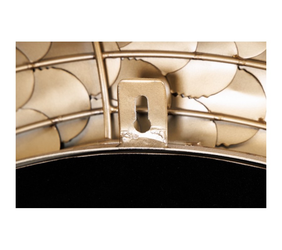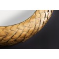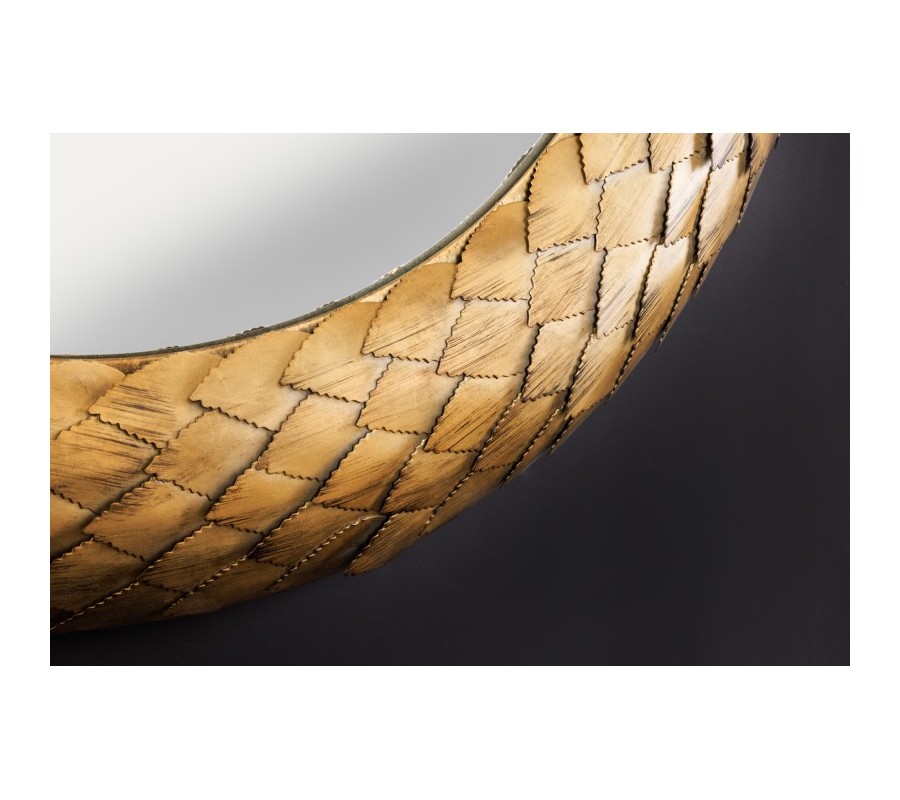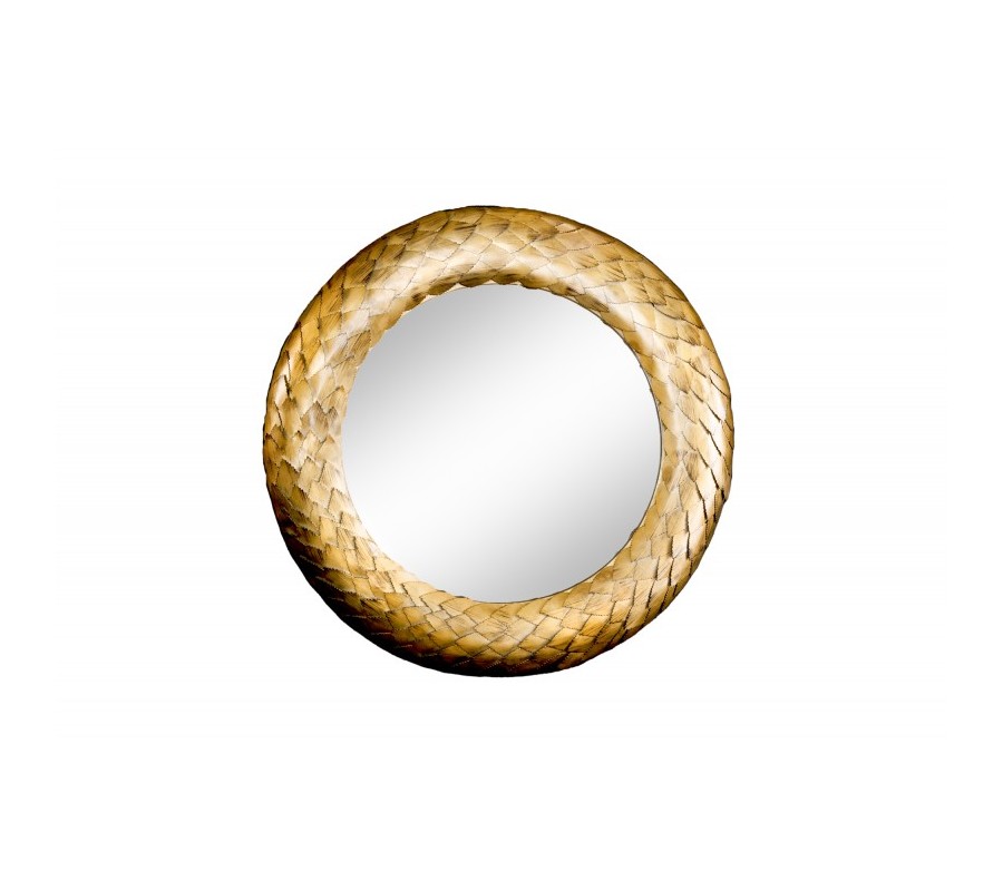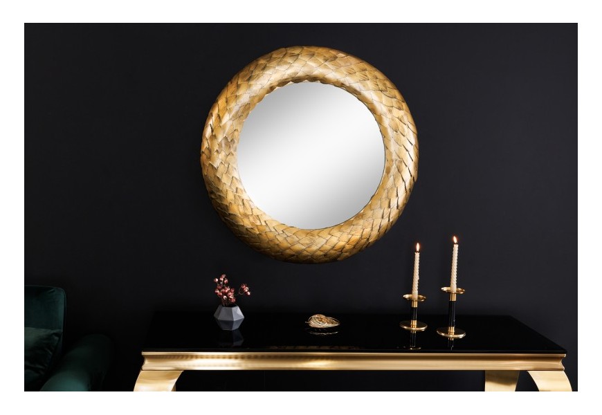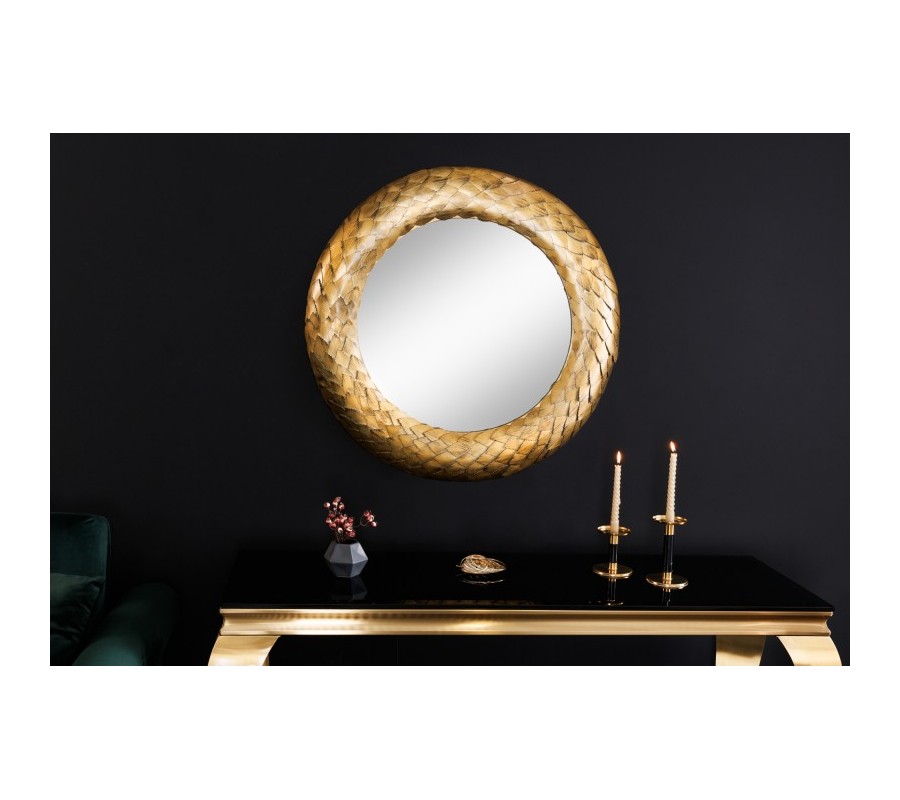 Dizajnové nástenné zrkadlo Rammstein do vašich priestorov vnesie exkluzívny antický nádych. Zaujme svojím elegantným okrúhlym rámom s jemným reliéfnym zdobením pripomínajúcim veniec a žiarivou zlatou farebnosťou. Precízne zdobenie rámu uvidíte na jemných lístočkoch a ich detailnom vyrezávaní. Rám je vyrobený z kovu a tak sa môže pýšiť výbornou kvalitou a odolnosťou, pričom zároveň umocňuje nádcyh antického štýlu. Zrkadlo Rammstein vkusne ozdobí ideálne jednofarebné kontrastné steny tmavomodrej, tmavozelene či červenej farby, ale svoje miesto si nájde aj na jednoduchších bielych stenách dizajnových obývačiek, chodieb, pracovní či iných reprezentatívnych priestorov.