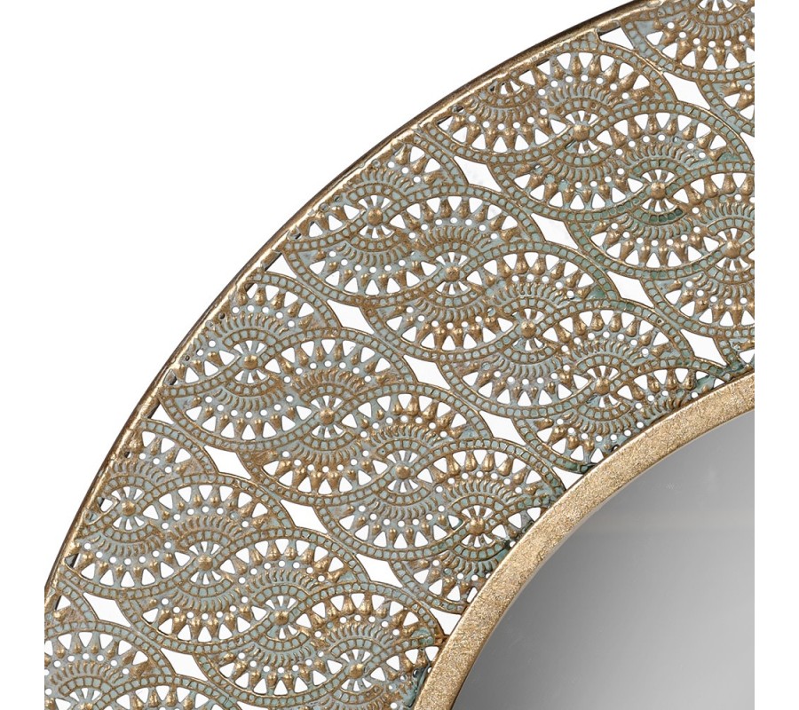 Okrúhle orientálne nástenné filigránové zrkadlo Loran so zlatou povrchovou úpravou a svetlomodrým sfarbením predstavujúcim oxidáciu medi je dizajnový prvok vhodný do predsiení so stenami tmavých ale aj svetlých farebných paliet. Zrkadlo má výraznú perforáciu, ktorá štýlovo nesie podstatu filigránu. Celková konštrukcia zrkadla pozostáva z kovu čo dodáva celkovému vizuálu produktu kompletnú pevnosť. Detailnosť rámu vyžaduje zladenie s minimalistickými doplnkami v neutrálnych farebných kombináciách. Zrkadlo sa nesie taktiež vo vintage štýle skvelo kombinovatelným s minimalistickým alebo moderným nábytkom. Reliéfna výzdoba je zložená z množstva pretkaných kruhových symbolov pripominajúcich slnko a jeho lúče.