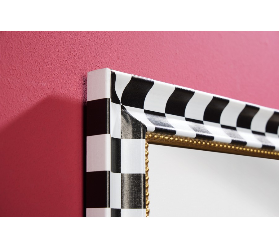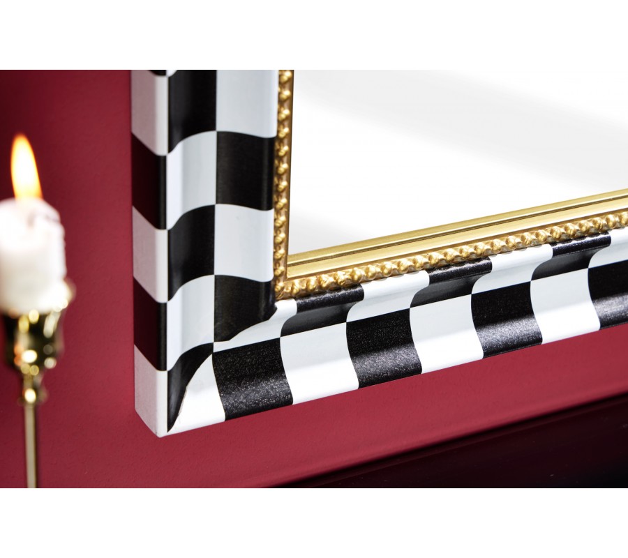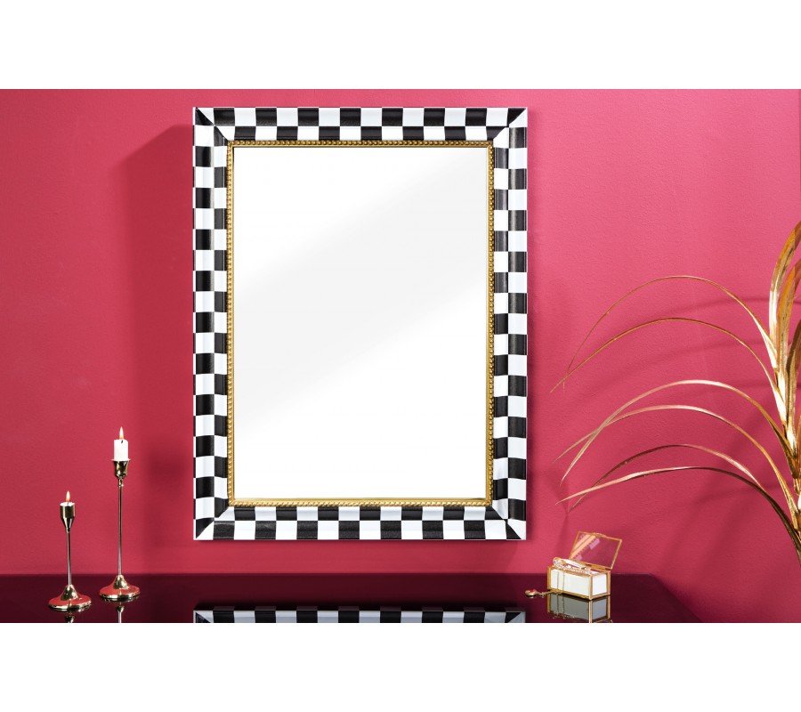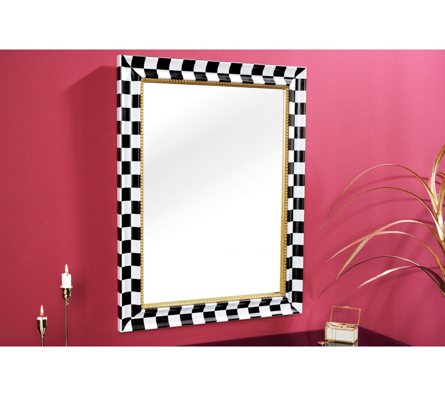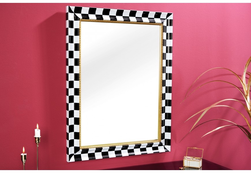 Šachovnicový vzor v čierno-bielej farebnej kombinácii pridáva zrkadlu moderný a grafický vizuálny efekt, zatiaľ čo zlatý detail zdôrazňuje glamour a eleganciu. Toto zrkadlo je vhodné pre tých, ktorí hľadajú výnimočný dizajnový prvok, ktorý pritiahne pozornosť a vytvorí sofistikovaný priestor. Zrkadlo krásne vynikne v kombinácií s neutrálnymi farbami dekorácií či nábytku ako sú čierna, biela, sivá a béžová.