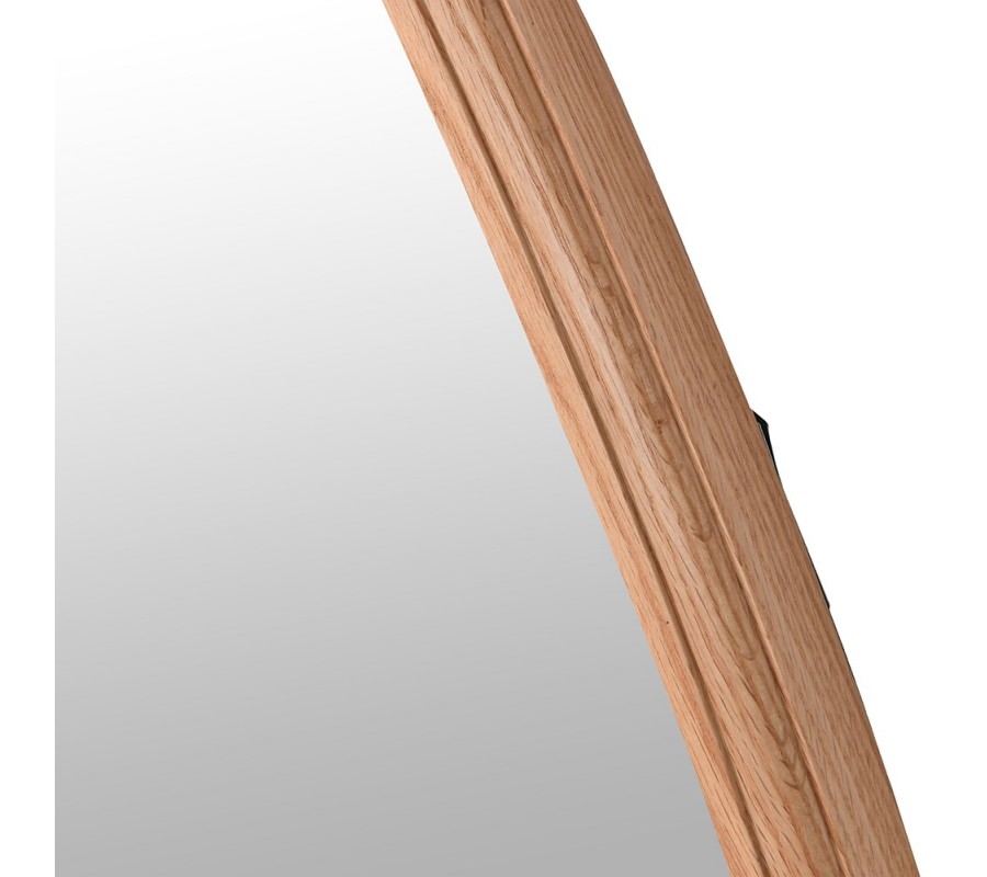 Nástenné zrkadlo Flaque je dôkazom, že aj moderný dizajn môže byť hravý a zaujímavý. Jeho tvar pripomína trojuholník so zaoblenými rohmi. Túto atypickú siluetu zvýrazňuje tenký dubový rám s ozdobným drážkovaním po svojom obvode. Svetlý odtieň dubového dreva pôsobí teplým dojmom. Zrkadlo je vďaka svojej výške vhodné do predsiene, spálne, či šatníka. Okrem praktickej funkcie vám zrkadlo pri vhodnom umiestnení taktiež pomôže presvetliť miestnosť odrazeným svetlom z lampy či okna. Hodí sa k nábytku v svetlých teplých odtieňoch, ale taktiež vynikne aj na pestrých stenách, napríklad v žltej či oranžovej farbe. Zrkadlo môžete umiestniť na stenu samostatne, alebo ako súčasť kompozície, v ktorej ho môžete doplniť zarámovanými obrázkami, fotografiami, alebo menším zrkadlom z rovnakej kolekcie, čím zdôrazníte príjemný jeho príjemný hravý charakter.