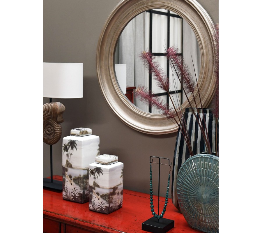 Okrúhle nástenné zrkadlo Barco dodá vášmu domovu vintage šarm. Široký rám je ozdobený hustým drážkovaním na vnútornej strane a smerom von prechádza do hladkej plochy, ktorá sa na okrajoch rámu dvíha hore a prostredníctvom drážkovaného zdobenia sa opäť prepája s centrálnou časťou. Rám je vyrobený z exotického dreva paulownie, ktorého kresba ladí s ozdobným reliéfom a vytvára príjemný harmonický pocit. Povrch je opracovaný tak, aby pôsobil zámerne zostarnutým dojmom, ktorý dodáva zrkadlu starožitný nádych. Hodí sa do priestorov zariadených svetlým nábytkom z masívneho dreva. Vďaka výraznému rámu ho môžete umiestniť aj na pestré farebné steny, kde bude mať nie len praktickú funkciu, ale bude pôsobiť aj ako dekoračný prvok. Celkovú kompozíciu môžete doplniť obrazmi alebo zarámovaný fotografiami, čim si vytvoríte vašu súkromnú galériu. Zrkadlo vám pri vhodnom umiestnení oproti oknu či svietidlu pomôže presvetliť miestnosť. Hodí sa tiež k výraznejším vintage kúskom v teplých svetlých odtieňoch.