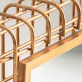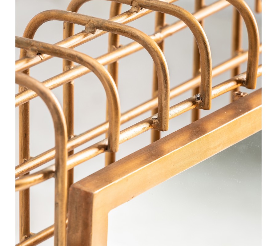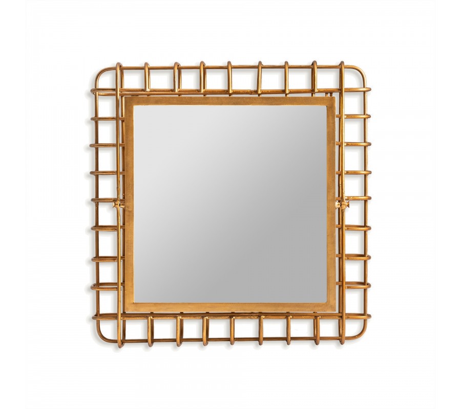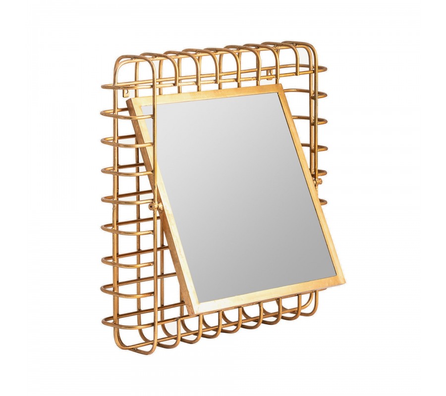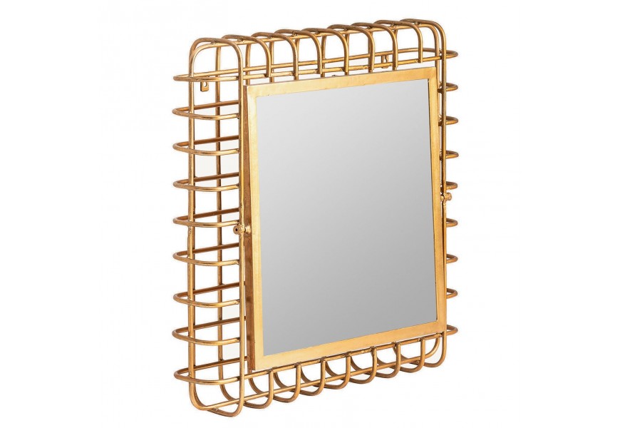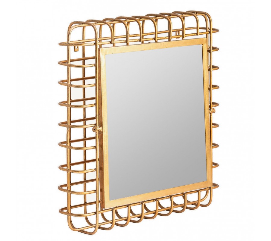 Dominuje mu kovový rám v zlatej farbe. Rovné línie tvoria štvorcový mrežovaný vzor. Zaoblené rohy zjemňujú celkovú siluetu. Dizajn rámu pripomína klietku, na ktorej prednej strane sa nachádza štvorcová zrkadlová plocha, upevnená dvomi kovovými skrutkami v strede bočných strán. Je ohraničená jednoduchým lineárnym rámom a vďaka upevneniu k drôtenej konštrukcii je možné ju mierne vyklopiť.