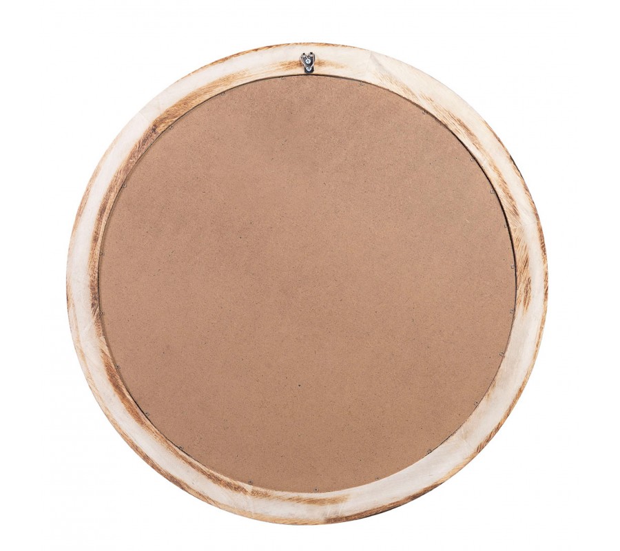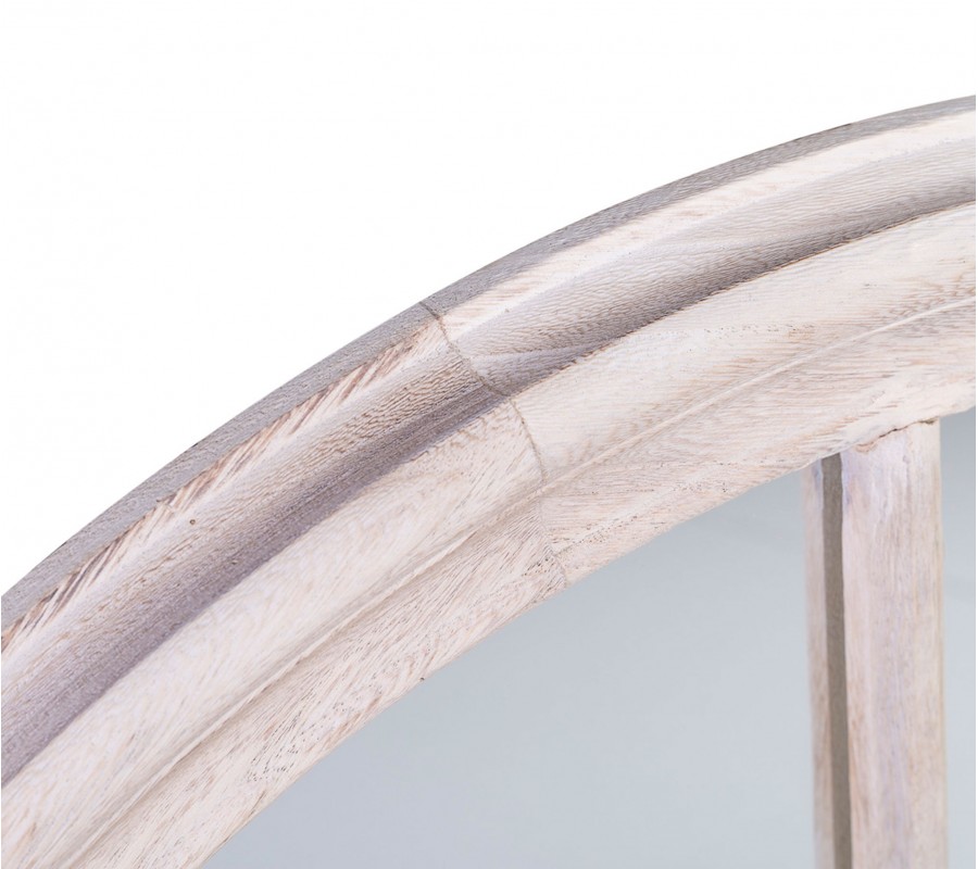 Povrch dreva je bielený a rám má tak elegantnú a subtílnu svetlú hnedú farbu s viditeľnými štruktúrami. Takto upravené drevo tiež pôsobí pôvabným vintage dojmom, čo dodáva zrkadlu osobitý charakter. Na zadnej strane sa nachádza kovový mechanizmus, pomocou ktorého zrkadlo zavesíte na stenu.
