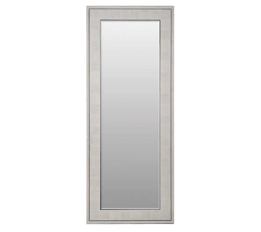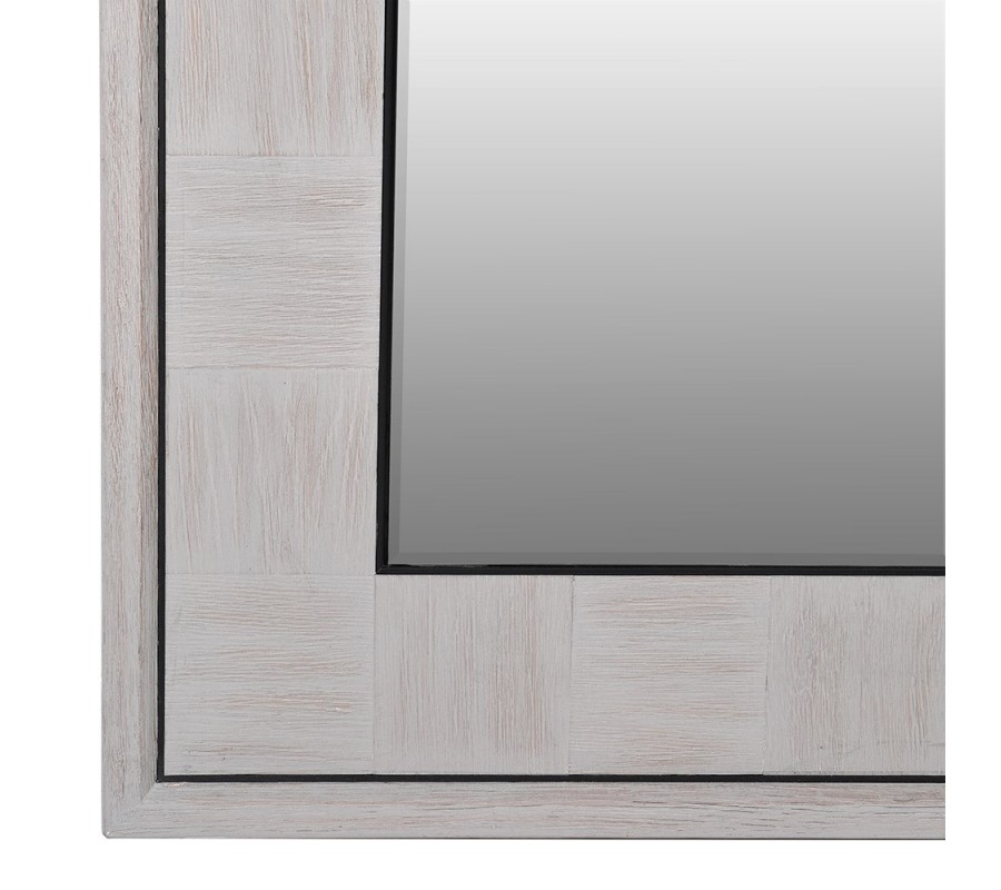 Zrkadlový rám v obdĺžnikovom tvare je vyrobený z kvalitného dubového dreva s ostrými pravidelnými hranami. Konštrukcia rámu zrkadla je dômyselne vyskladaná z kuskov masívneho dreva štvorcového tvaru kde jednotlivé kúsky su voči sebe otočené o 90 stupňov čím pripomínajú šachovnicový resp. parketový vzor. Nenápadná jemná čierna vyrezávaná linka na ráme decentne obzvláštňuje celkový vizuál zrkadla a vďaka off white farbe, je ľahko kombinovateľné s inými farbami ako sú biela, čierna, hnedá či krémová. Jednoducho zapadne do predsiení, obývačiek či izieb v modernom štýle a zjednotí tak celkový dojem vašeho domova.