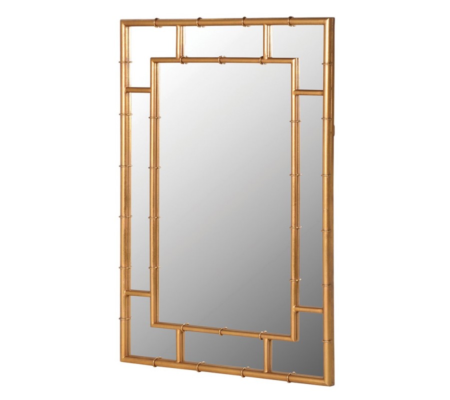 Dizajnové obdĺžnikové nástenné glamour zrkadlo Finch s kovovým rámom v zlatej farbe s ozdobnými kruhovými spojmi 100 cm
