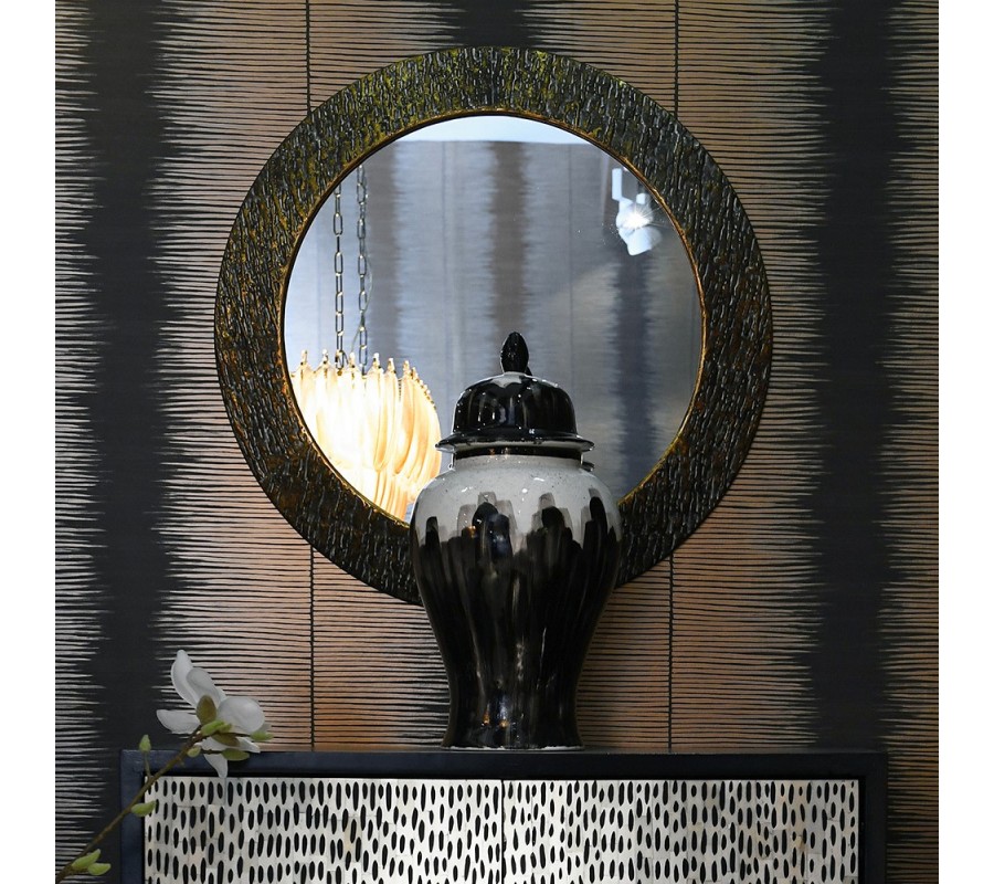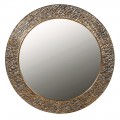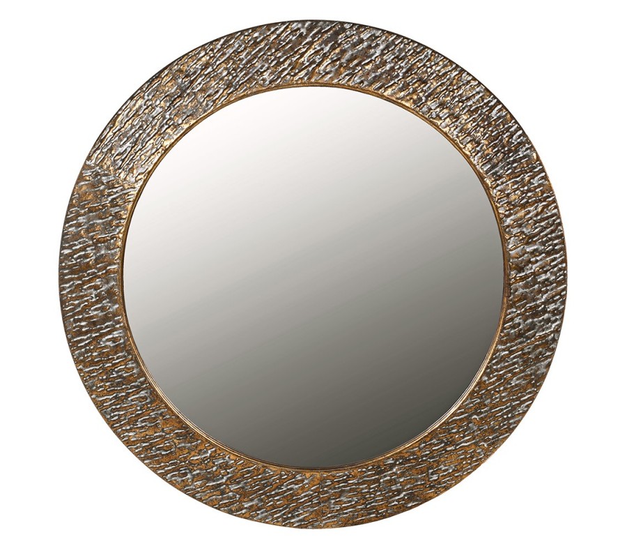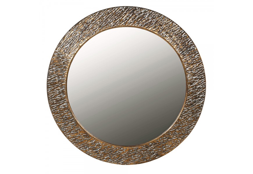Okrúhla zrkadlová plocha je zo zadnej časti spevnená dyhovaným drevom, ktoré zaručuje vysokú pevnosť a stabilitu doplnku. Rám je vyrobený z kovu a má symetrický kruhový tvar. Jeho povrch zdobí nepravidelný reliéf s lineárnou diagonálnou tendenciou. Vyššie časti rámu majú jasnú metalickú bronzovú farbu, zatiaľ čo v hlbších ryhách sa nachádza tmavá patina, zdôrazňujúca štruktúru vzoru. Zrkadlu tiež dodáva originálny starožitný vizuál.