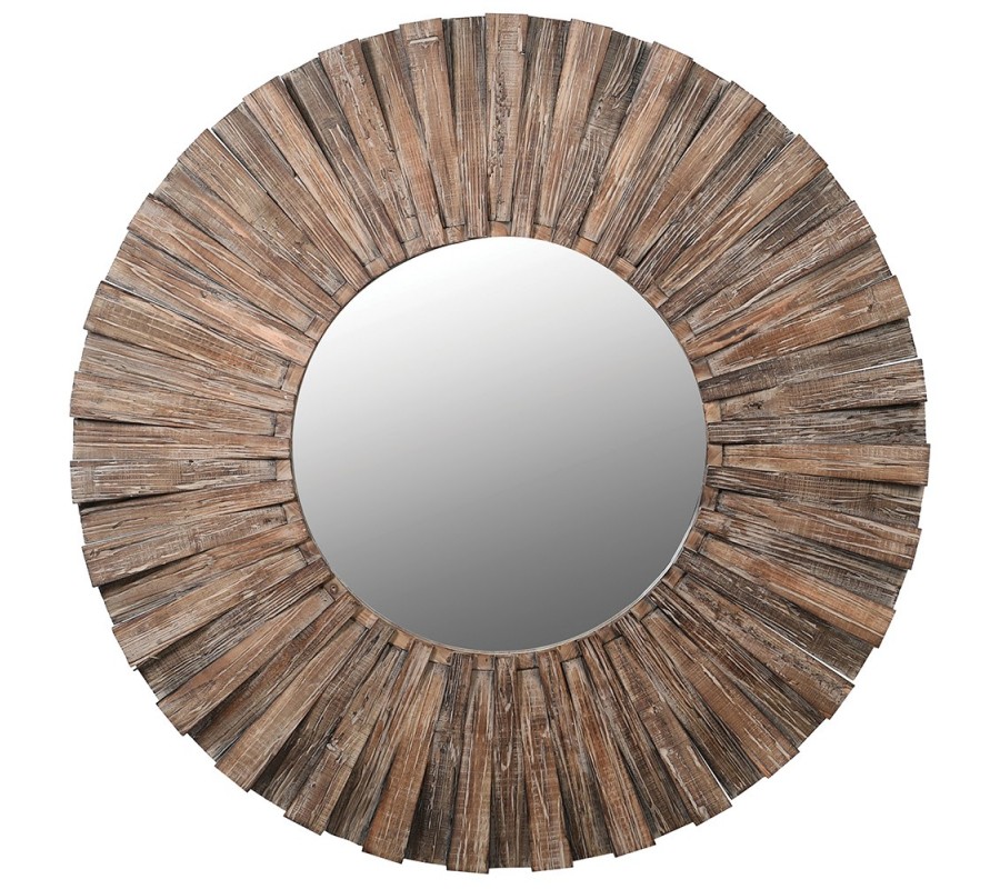 Dizajnové etno okrúhle nástenné zrkadlo Radiant s rámom z dreva v hnedej farbe s vintage efektom opotrebovania 120 cm
